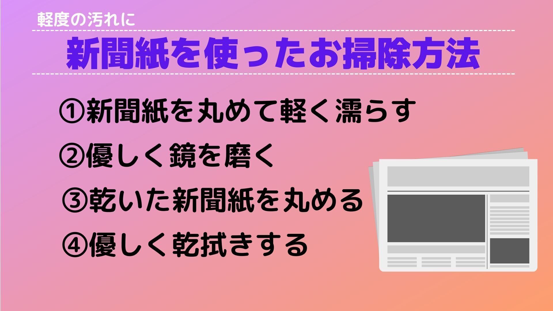 軽い汚れを落とすには、新聞紙が便利です。やり方はとても簡単。くしゃくしゃに丸めた新聞紙1枚を軽く濡らして、スポンジのように鏡を磨きます。新聞紙のインクがくすみなどを取り除いてくれます。その後、乾いた新聞紙を丸めて、乾拭きをして完了です。洗剤も使うことなく、身近な道具であっという間に掃除することができます。新聞紙を濡らしすぎてしまうと、磨きにくく、ポロポロと新聞紙が破れやすくなってしまいますので、軽く濡らすことがポイントです。