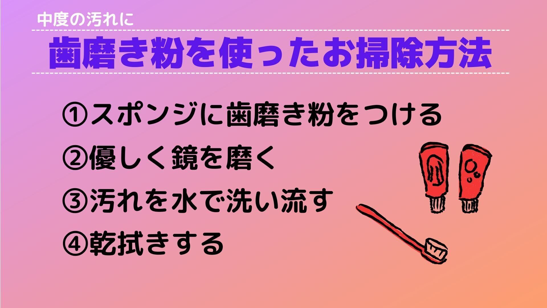 中度の汚れには、これまた身近な歯磨き粉が便利です。スポンジに歯磨き粉をつけて、優しく鏡を磨いていきます。力任せに磨いていくと、傷がついてしまうこともありますので、優しく磨くがポイントです。磨いた後は、水で洗い流し、乾拭きをして完了です。水で洗い流すことができない場合は、マイクロファイバークロスをしっかりと水で濡らして、歯磨き粉が残留しないように繰り返し水拭きをしましょう。水を流したり、水拭きをしたりした後に、乾拭きを怠ると、また水気が残り、水垢の原因になりますので、乾拭きは必ず行って下さい。