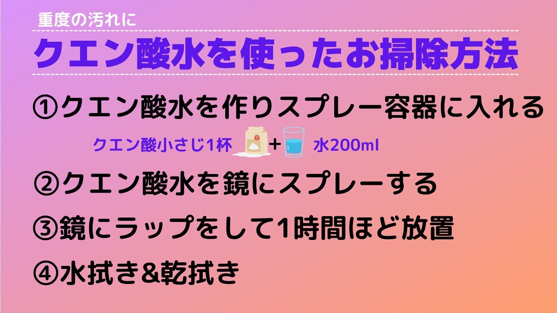 重度の汚れには、クエン酸を使っての掃除が効果的です。まずは、クエン酸スプレーを作ります。スプレーボトルに水200mlを入れ、クエン酸を小さじ1入れ、よく振り、クエン酸を溶かします。これでクエン酸スプレーの完成です。鏡にクエン酸スプレーを吹きかけ、その後、ラップで覆い、1時間放置します。その後、水拭きをし、仕上げに乾拭きをして完了です。クエン酸が鏡に残留してしまうと、酸焼けといい、白く濁ったような汚れになりますので、念入りに水拭きをしましょう。また、クエン酸が金属部分にかかると、錆びてしまうリスクがありますので、金属部分にはクエン酸がかからないように注意しながら掃除をしてみて下さい。