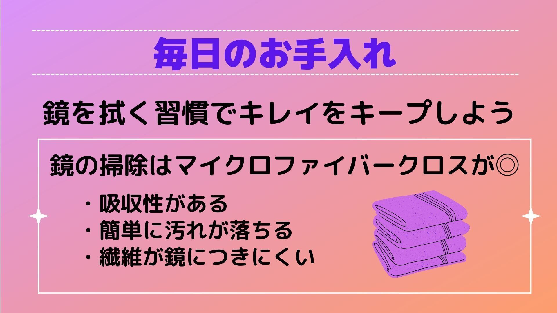 鏡の掃除には、マイクロファイバークロスがおすすめです。マイクロファイバークロスは、細かな繊維がしっかりと汚れを絡みとってくれます。吸水性もあり、キレイに拭き上げてくれます。また、綿のタオルと違い、マイクロファイバークロスの繊維が鏡についてしまうこともありません。毎日、鏡を拭く習慣をつけることで、キレイをキープすることができます。寝る前に拭くなど、毎日のルーティーンにすると掃除し忘れないのでおすすめです。