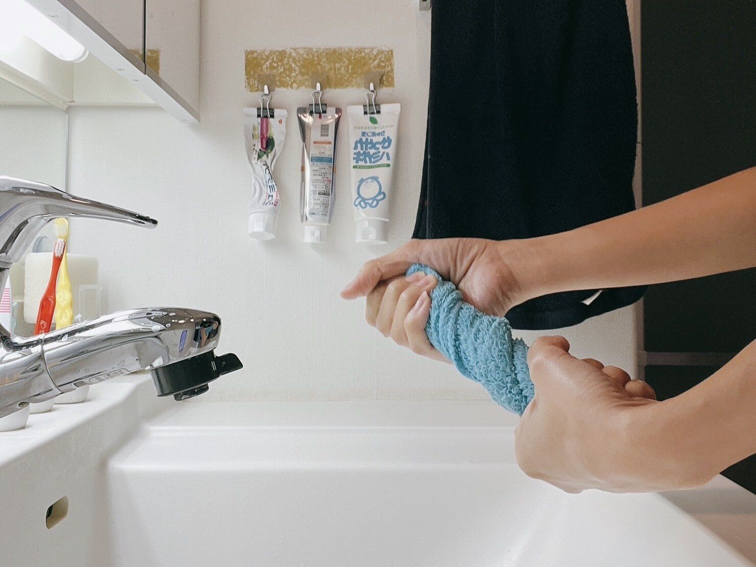 タオルは毎日使います。洗顔をする時や歯磨きをする時、1日に数枚タオルを使うこともあると思います。そのタオルを洗濯機に入れる前に、鏡を拭いてみて下さい。タオルもある程度湿っている状態ですので、歯磨き粉の飛び散りなども拭き取れます。毎日の習慣にすることで、頑固な水垢汚れを防ぐことができます。家族にもタオルで「ついで掃除」を共有することで、常にキレイをキープしていきましょう。