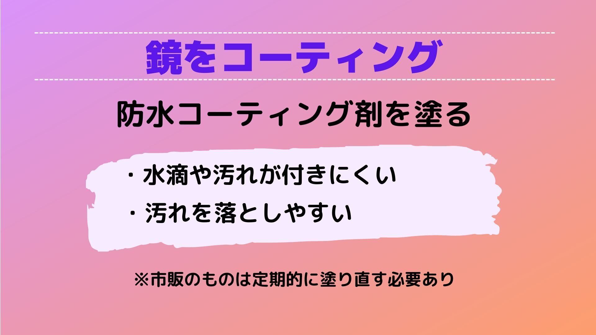 鏡に防水コーティング剤を塗ることで、水滴や汚れがつきにくくなります。また、汚れがついたとしても、落としやすいというメリットもあります。市販のコーティング剤を使用すれば、自分で定期的に塗布することができます。専門業者さんの施工とは違い、効果期間は短いですので、定期的に塗布する必要はでてきます。製品によって持続期間も異なりますので、コーティング剤の取扱説明書をご確認下さい。