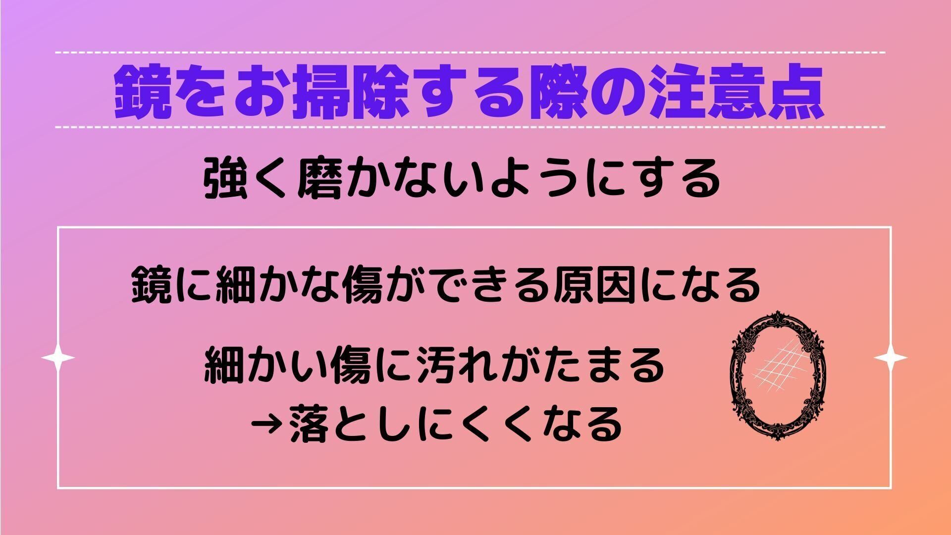 鏡の掃除をする際に、力任せに擦ると、細かい傷がついてしまいます。この傷に汚れが溜まり、落としにくくなってしまうという難点があります。鏡の内部に水が入ると、腐食して、黒いシミが浮かび上がってきてしまいます。この黒いシミは掃除では取ることはできません。こうなると、鏡の交換をするしかありません。せっかくの掃除で鏡を傷つけ、鏡の寿命を短くしてしまうことは避けましょう。鏡はデリケートな素材です。ゴシゴシと擦ったからといって、キレイになる訳でもありません。あくまで、汚れと洗剤が中和されて汚れが落ちていきます。力の入れすぎには気をつけましょう。