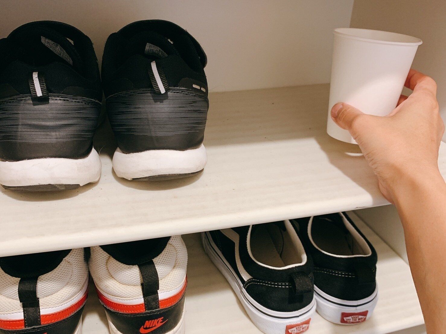 靴箱の消臭にも重曹が便利です。紙コップに重曹を粉のまま入れ、靴箱に置きます。重曹は「消臭」だけでなく「吸湿」も行ってくれるので、靴箱掃除に最適。