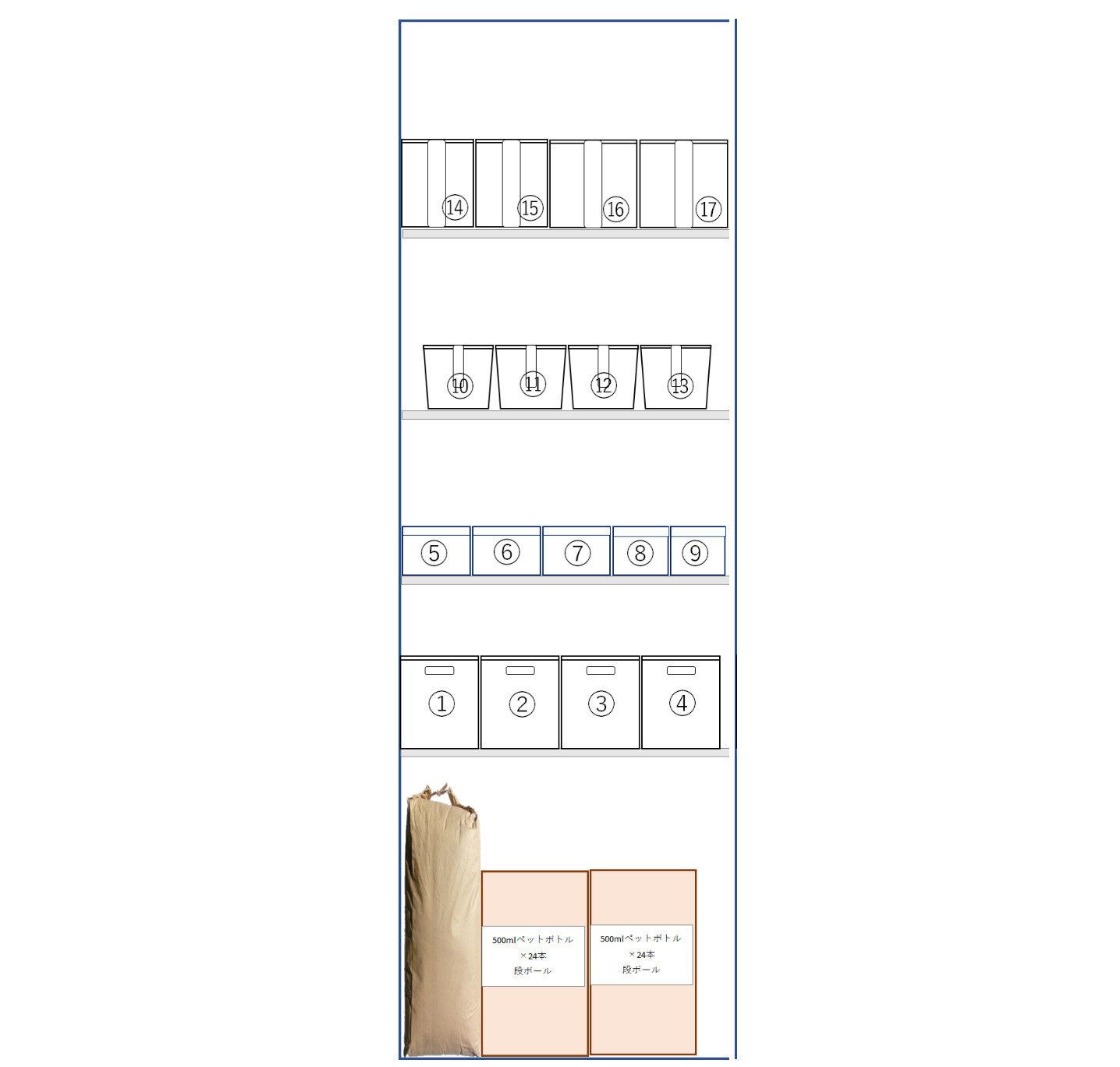 画像は70~80cm間口のパントリーに、今回ご紹介したアイテムを配置したイメージ図。最下段にはお米30kg、500ml ペットボトル24本入り2箱を置き、それより上のボックスには以下のものが収納されています。