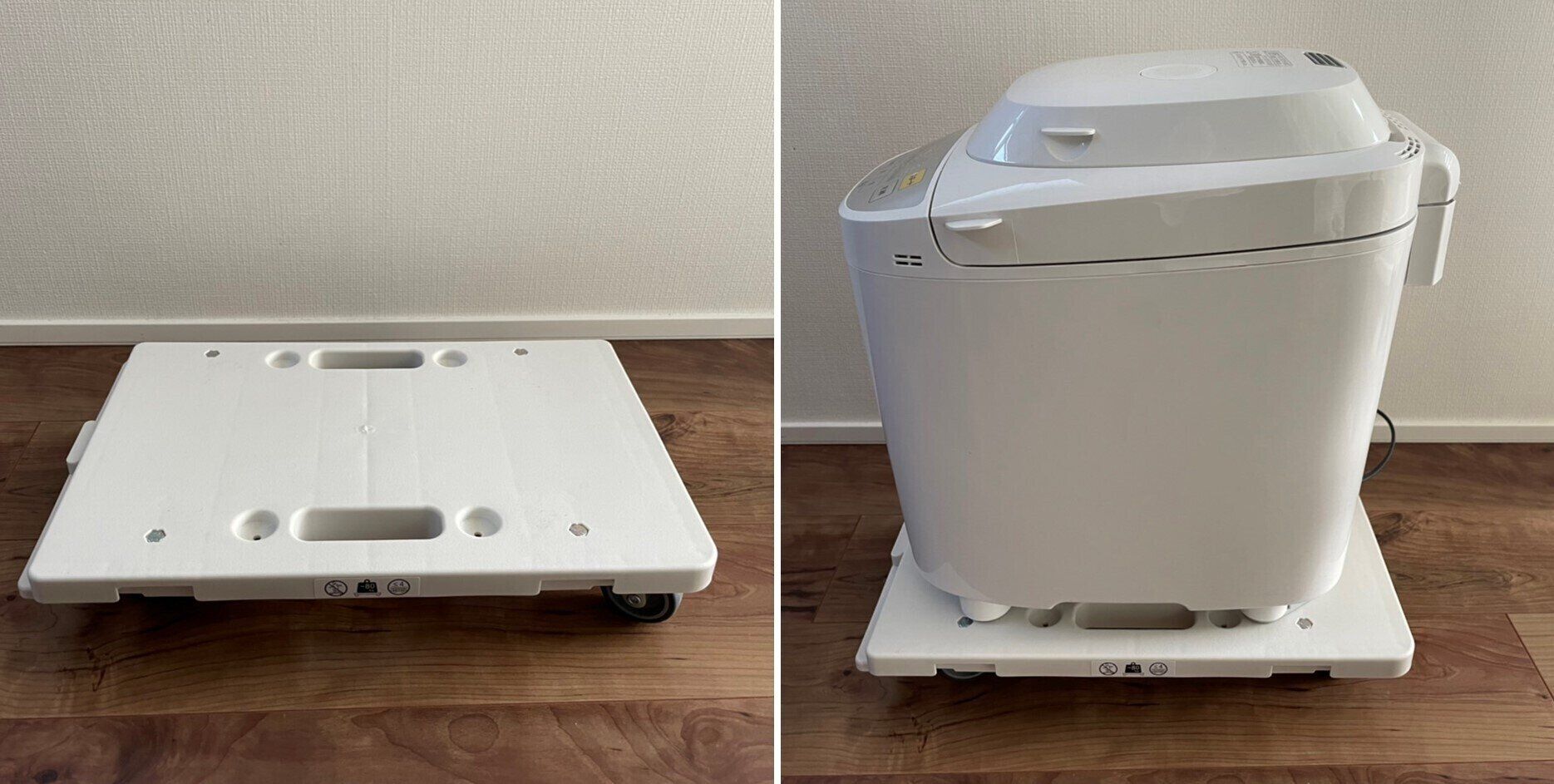 写真のように重たいホームベーカリーなどを置いても、使うときにはスムーズに出し入れが可能になります。サイズは幅27.5×奥行41×高さ7.5cm。