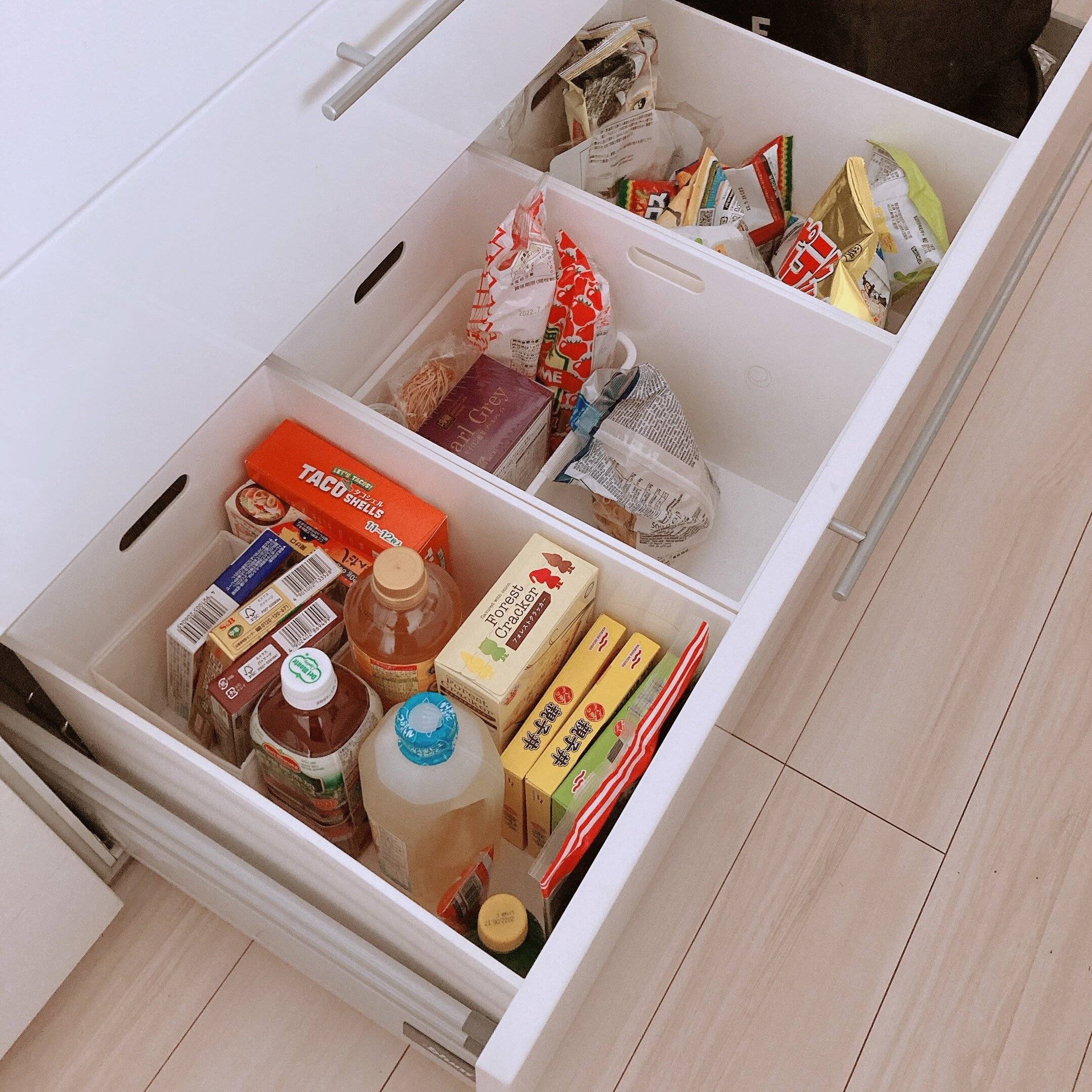 ストック食材のスペースにゆとりがあれば急に増えたときでも置き場所に困って出しっぱなしになってしまうこともありません。