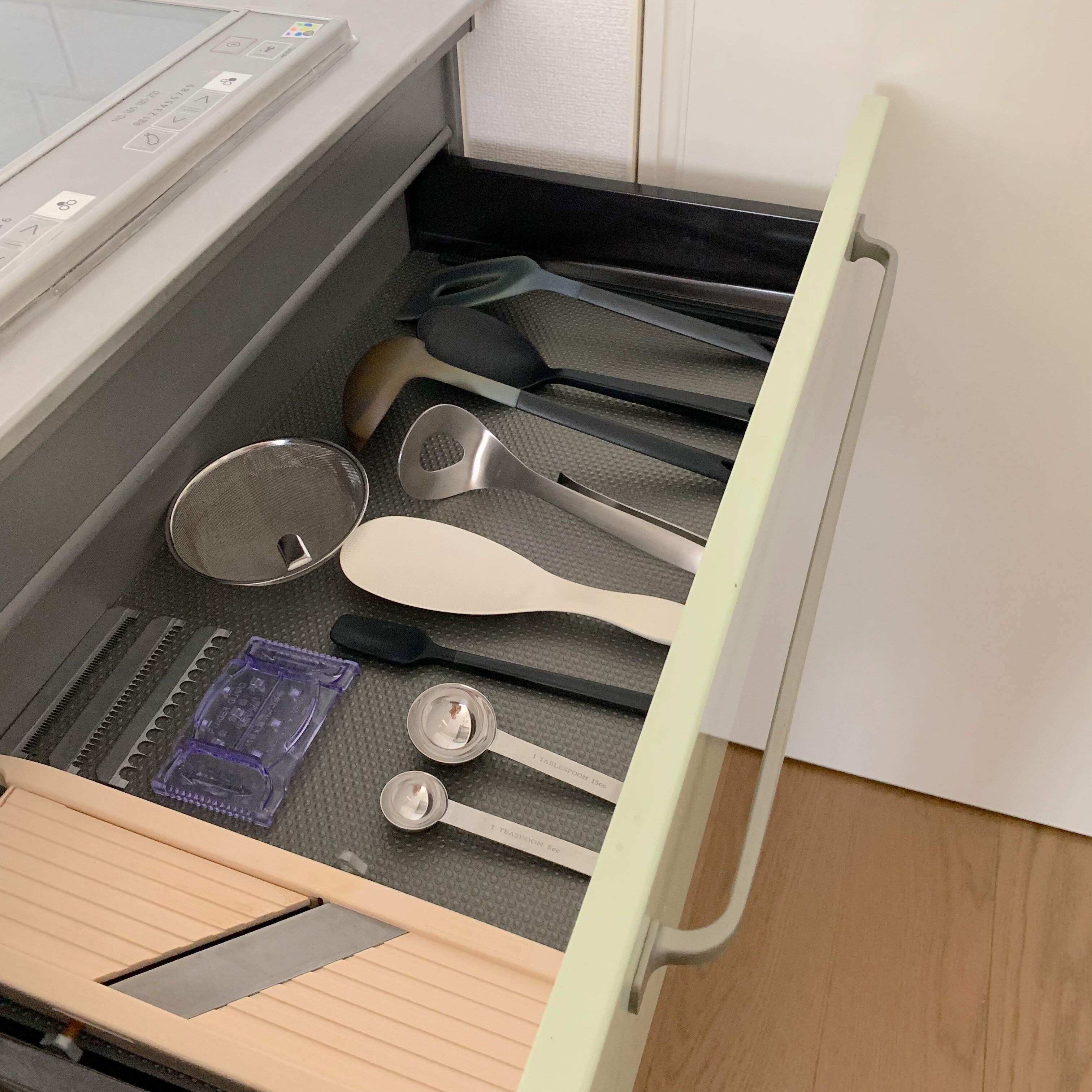 収納用品はなるべく使わず、キッチングッズや食器を収納場所に並べるだけにしています。こうしておけば、キッチングッズや食器を使っているときに、収納場所をサッと拭くだけで掃除ができます。ほこりや汚れもたまりにくく、掃除がラクになります。