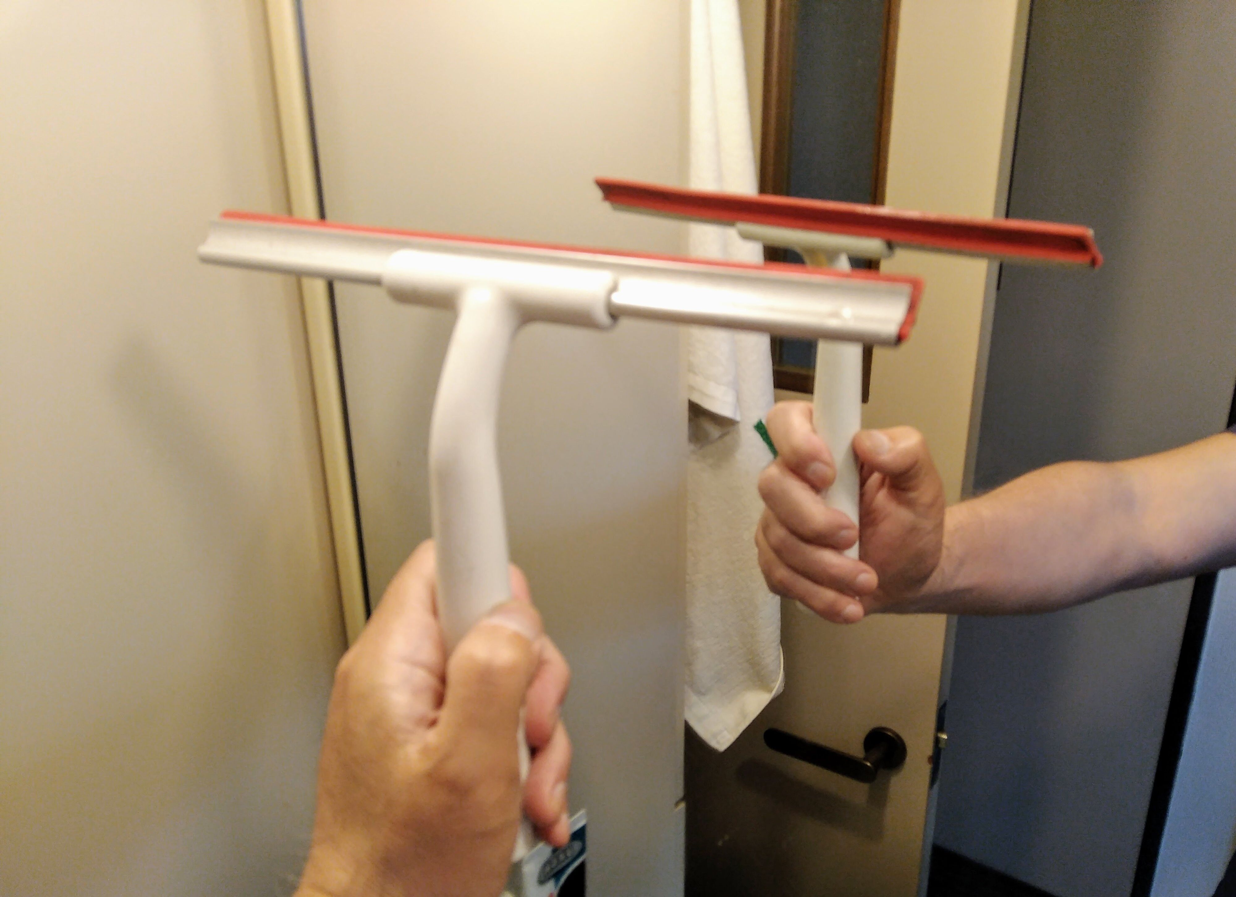 ではどうするかというと、使うのは水だけ。鏡に水を吹きつけて、スクイージーをさっと滑らせて水や汚れを取り除きます。