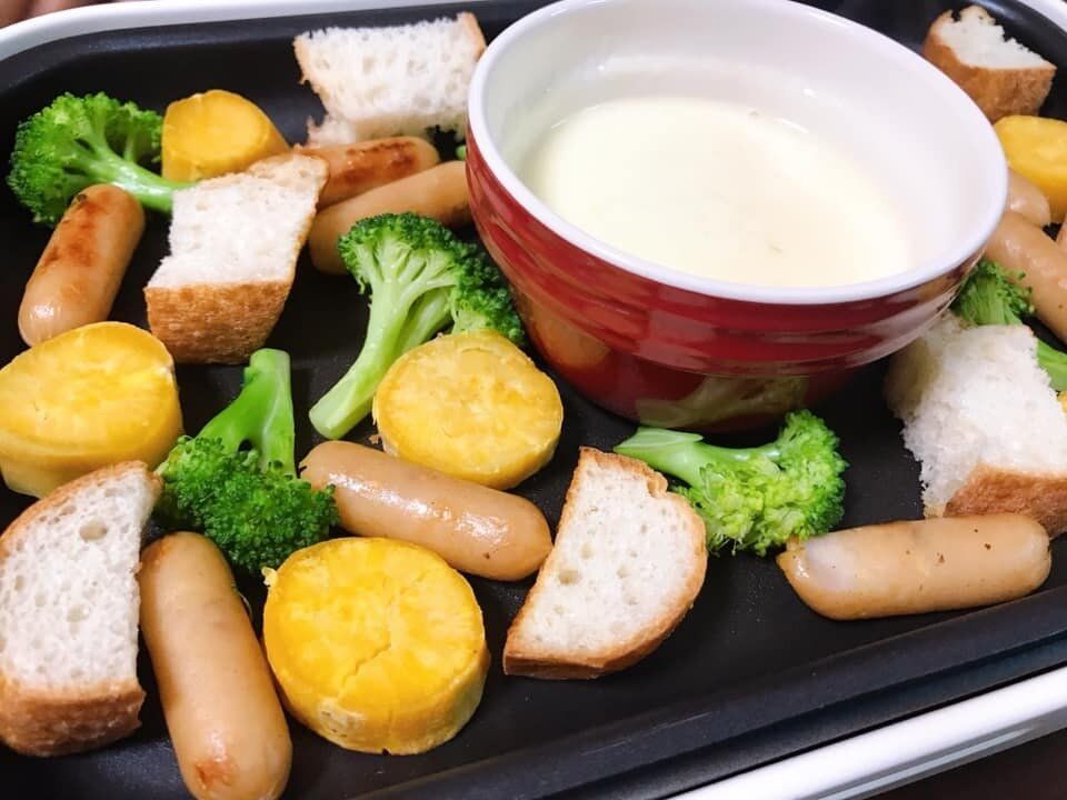 ホットプレートで温めながら、まわりで食材を焼いてつけるだけでチーズフォンデュを楽しめます。手抜きなのにちょっと特別感が出て、家族でワイワイ食べられます。