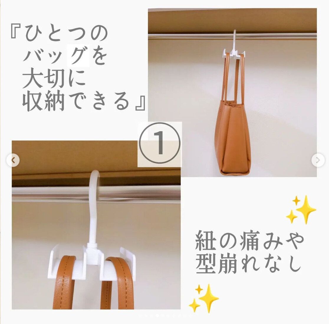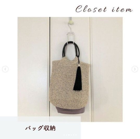 ダイソーで買えるバッグ収納ハンガーは、それぞれのフックが360度回転するのでバッグ同士が重ならず、出し入れがしやすいのが特徴です。ひとつのハンガーで4個までバッグを省スペースで収納することができるので、クローゼット内を有効活用できて便利です。