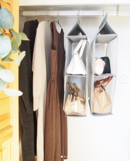 こちらはクローゼットの中に収納できるバッグ収納。2段になっていて、バッグを上下に並べて収納することができます。種類別や大きさなどで分けられるので便利ですね。