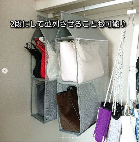 こちらは楽天で販売されている「吊り下げ式バッグ収納ハンガー」。半面がクリアになっているため、どこに何を収めたのかすぐ把握することができます。1つにつき6個のカバンを収納できるのもうれしいポイント。クローゼット内に吊るすだけでいいので、気軽に取り入れられますね。