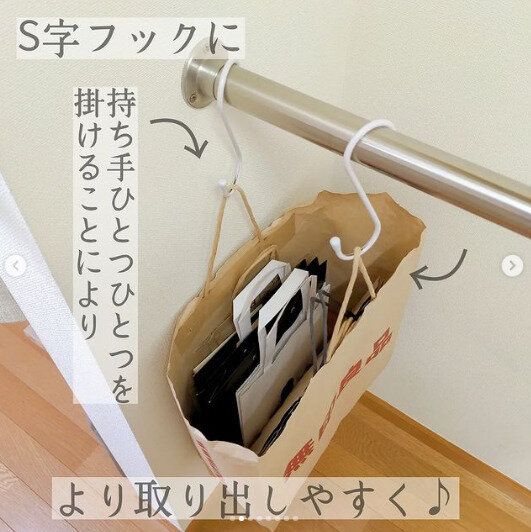 紙袋の収納、しまいこんでいる人も多いですが、こちらは目からウロコのアイデアです。大き目の紙袋を使いS字フックに引っかけて収納しています。これなら取り出しやすくしまいやすい!