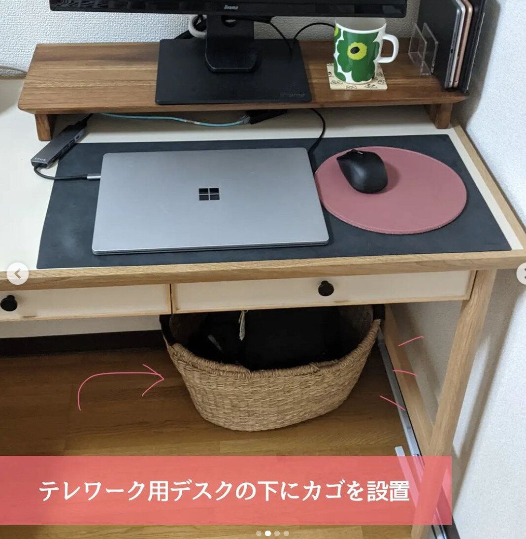 デスク下にカゴを設置してバッグの定位置をつくると、お仕事中も必要なものを取り出しやすく、導線が確保できて使い勝手も◎。バッグがすっぽり入るサイズを選ぶと見ているだけで心地よいです。