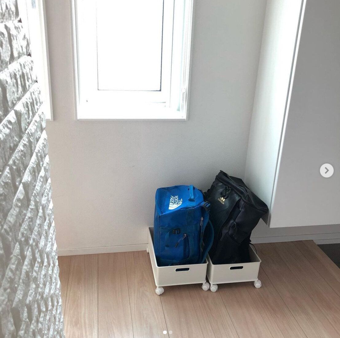 頻繁に使うバッグや外からの汚れが気になるバッグは、お手入れが簡単なケースに入れてまとめておくのもおすすめです。ニトリのケース×キャスターでコンパクトな収納ケースをつくれば、取り出しもお手入れも簡単に。玄関先に置いてもすっきり見えます。