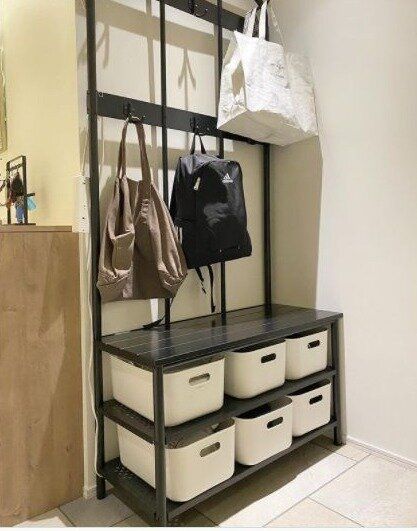 こちらはIKEAの収納ラック。フックがついているので、バッグや上着などをそのままかけることができます。下段は棚になっていて、無印良品のやわらかポリエチレンケースがシンデレラフィット。見た目もおしゃれな収納ですね。