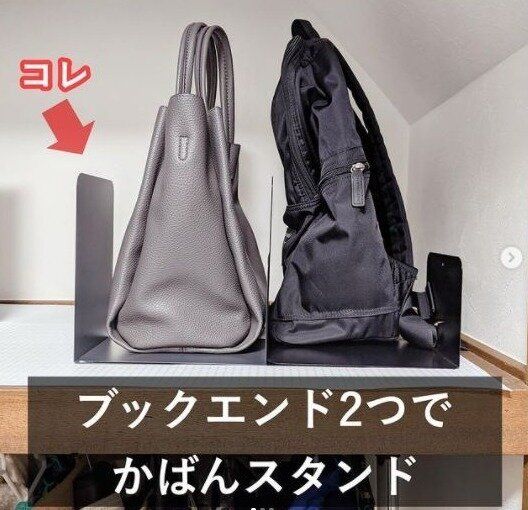 カバンがパタンと倒れるのがストレス……というときにぴったりの、ブックスタンドを活用した収納アイデアです。ダイソーならプチプラでそろえられるので、気軽にトライしやすいのもポイント!スタンドを複数個使えば、たくさんのカバンを美しく収納できそうですね。