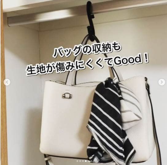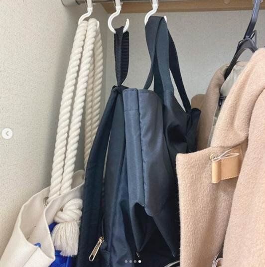 このS字フックがバッグ収納にとっても便利!このようにクローゼットにかければ、やわらかい素材なのでバッグを傷めることもありません。