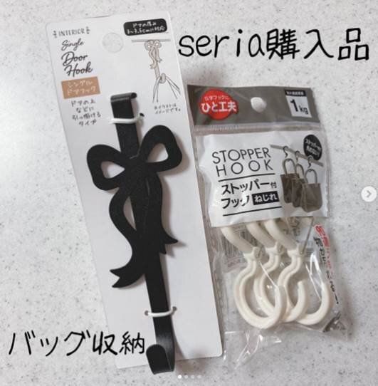 セリアで販売されているストッパーつきフックにねじれタイプが新登場しました。ねじれていることで90度ちがう向きにものを吊るすことができ、バッグ類をすっきり収納することができます。またストッパーつきなので取り出す際にフックが外れるストレスもありません。