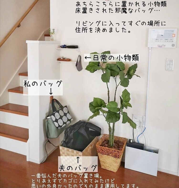 いつも使っているカバンが決まっているのであれば、部屋まで持っていかず玄関に保管場所を決めるのもいいですね。これからの季節、感染症対策にもなりそうで、一石二鳥です。