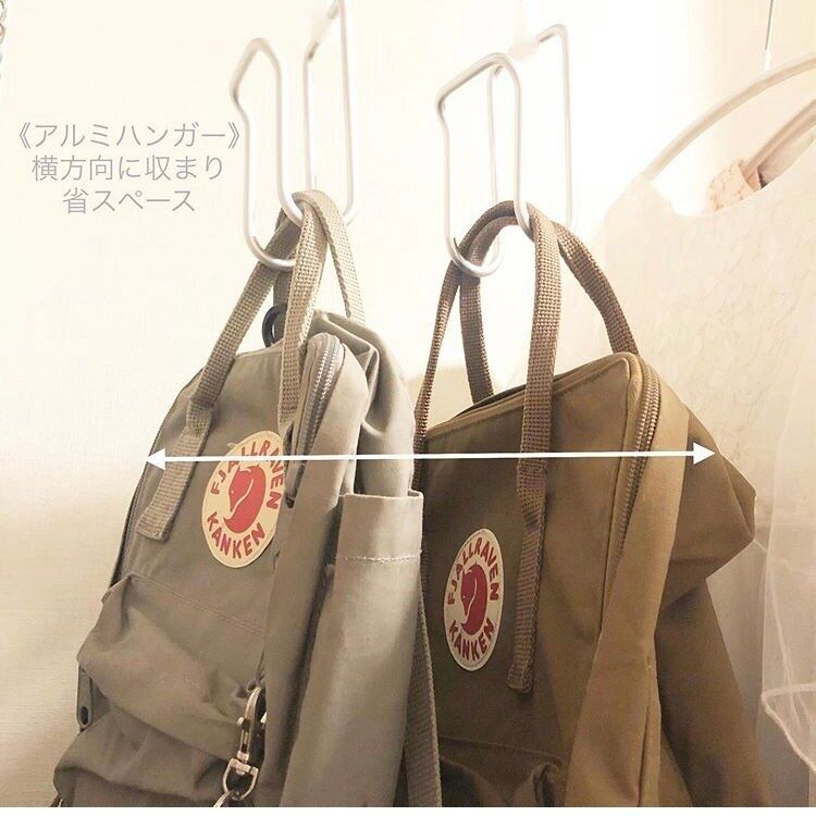 無印良品のアルミハンガーを使えば、カバンの向きをそろえてかけられるので、複数かけても省スペースに!見た目もきれいになるのでクローゼットが一気にすっきりします。