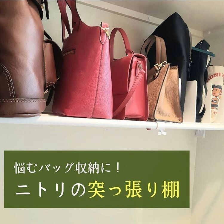 クローゼットは洋服をかけてすでにいっぱい…なんて人も多いのではないでしょうか?そんな人は新しく棚を設置すればいいんです!ニトリの突っ張り棚と、同じくニトリのブックスタンドを使えばカバン専用棚のできあがりです。突っ張り棒の耐荷重量も20kgなので、安心して収納できます。