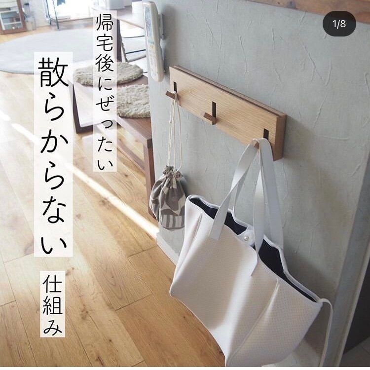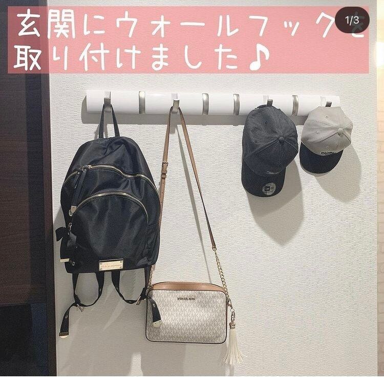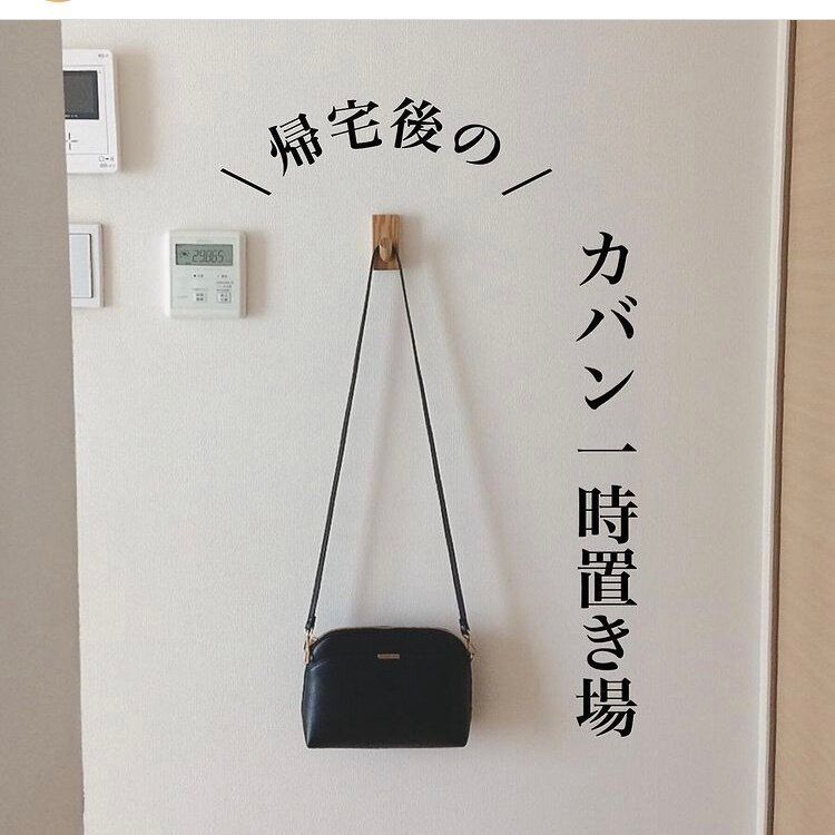 買い物から帰宅した後、カバンを床や机に置きっぱなしにしがちですが、部屋が散らかる原因になりますよね。そんなときは、カバンの一時置き場としてフックを活用。そうすれば荷物整理をする間はかけておけます!最低限の大きさにすることで、あくまでも一時置き場として活用できます。
