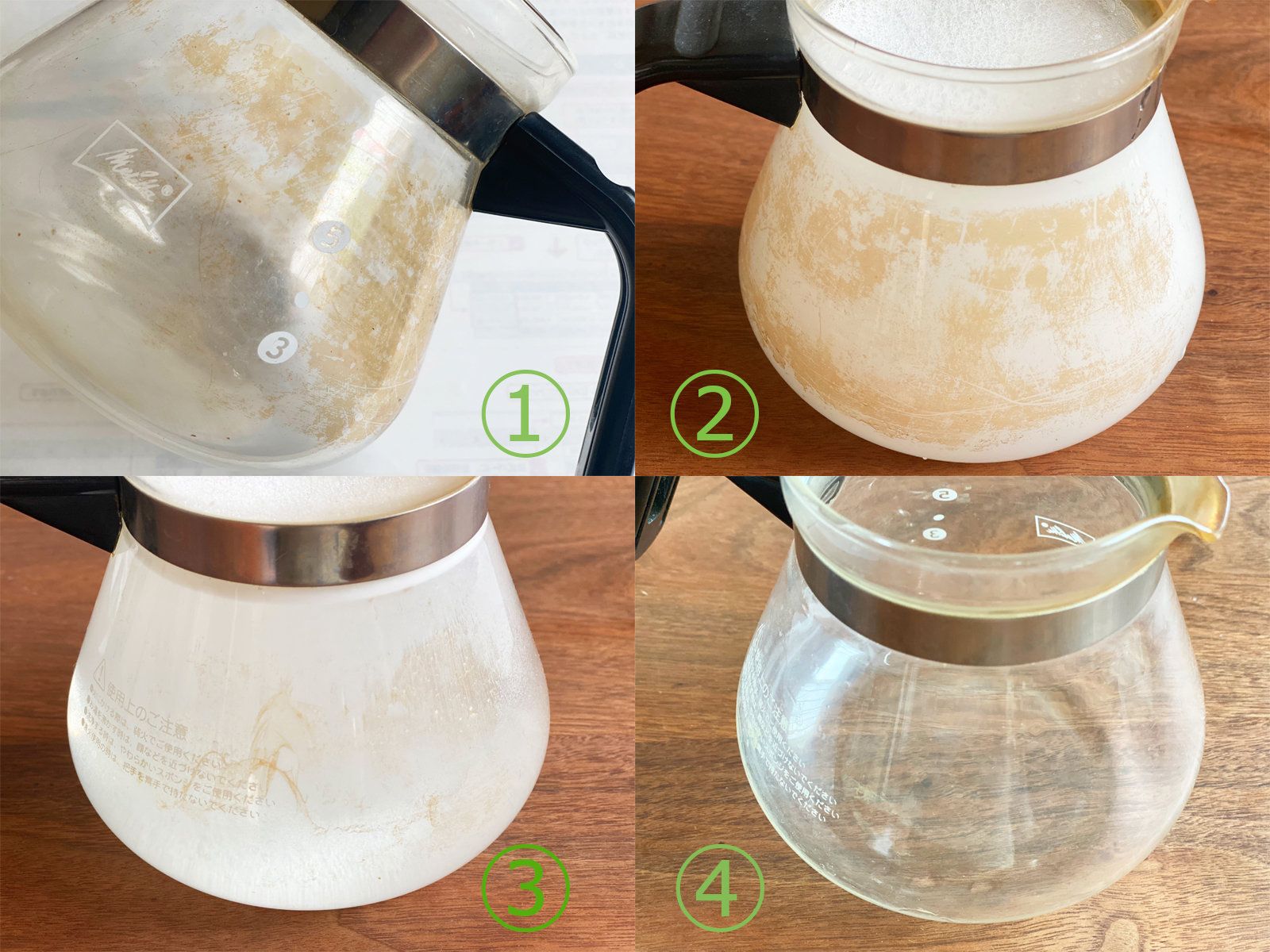 実際に頑固な茶渋のついたガラスポットにオキシウォッシュを使ってみました(写真1)。小さじ2程度のオキシウォッシュを入れて、40℃前後のお湯を注ぎいれると、泡が立ちます(写真2)。このまま10分ほど放置すると、こすらずとも茶渋が自然と浮いてきます(写真3)。写真4は、水でざっと洗い流して、キッチンペーパーで拭いたもの。一度もこすらずに、ここまでキレイになりました。