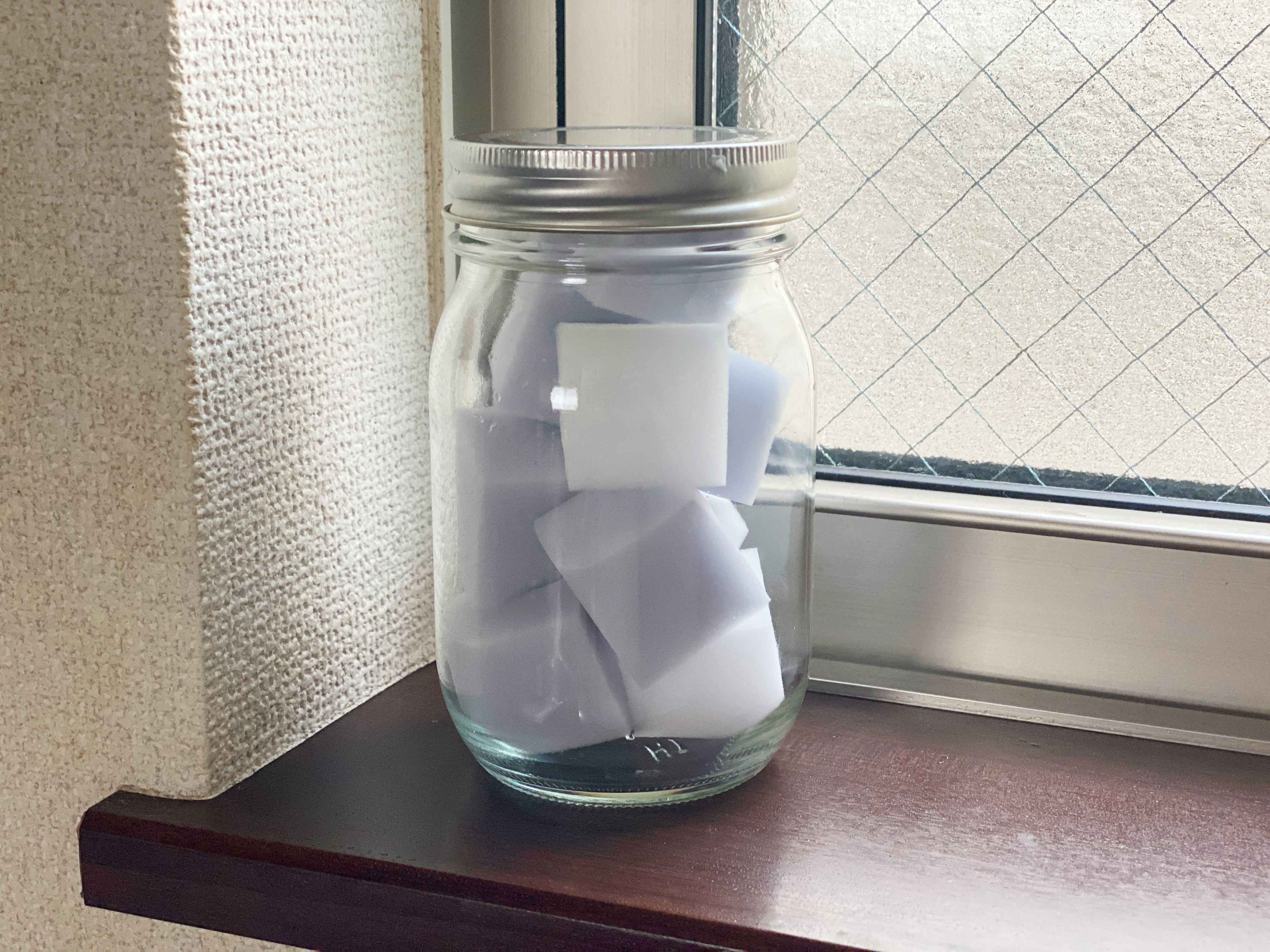この商品のいいところは小さくて収納しやすく、見た目もいいところ。白とグレーのモノトーンのメラミンスポンジが20個入っていて、びんなどに入れておけば、ただのメラミンスポンジがオシャレな雑貨のように見えます。これなら目につくところに出しっぱなしでも違和感がありません。