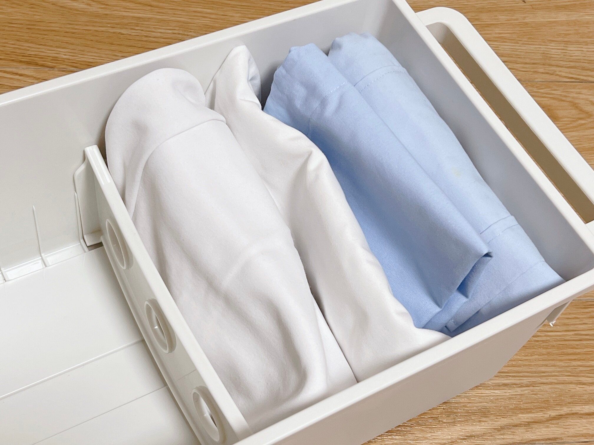 仕切り板が1つついているので、途中まで並べた衣類が倒れてしまうのも防いてくれます。中身が分かりやすいようにふたに透明の窓があるものいいですね!