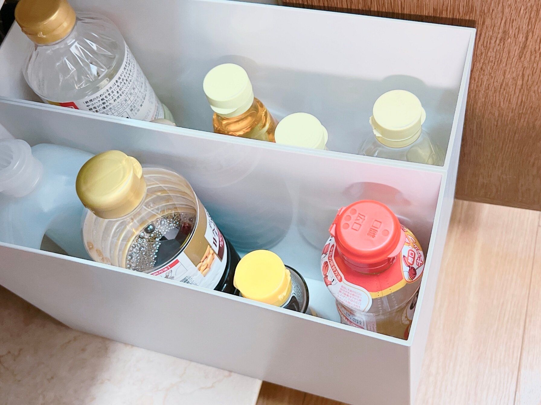 キッチン下の調味料入れにもピッタリ!背が高くて倒れやすい調味料を並べて収納すると見た目もスッキリだし、よく使うものを手前に置くと取り出しやすいですよ。