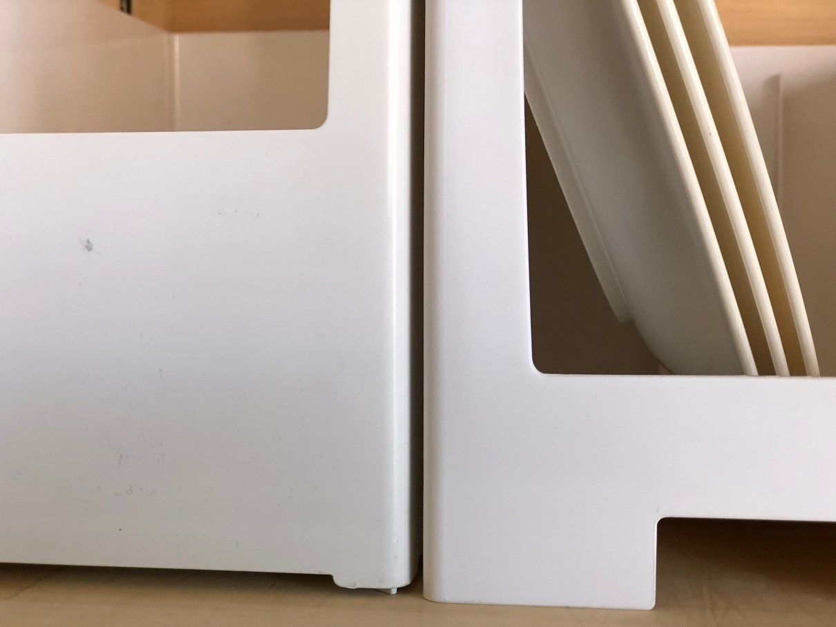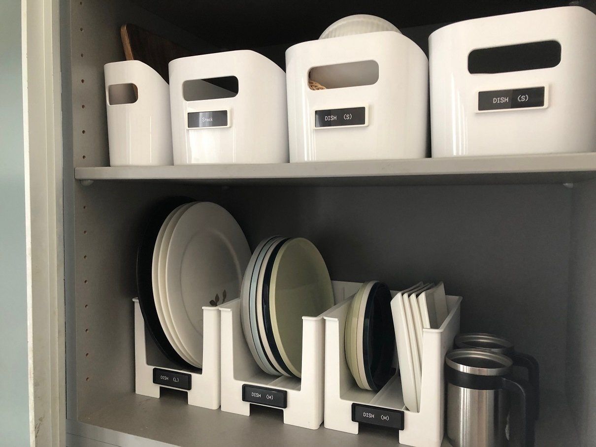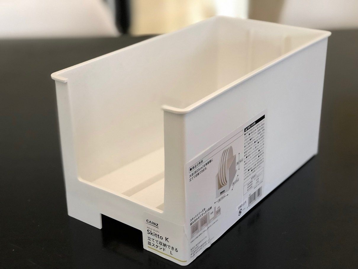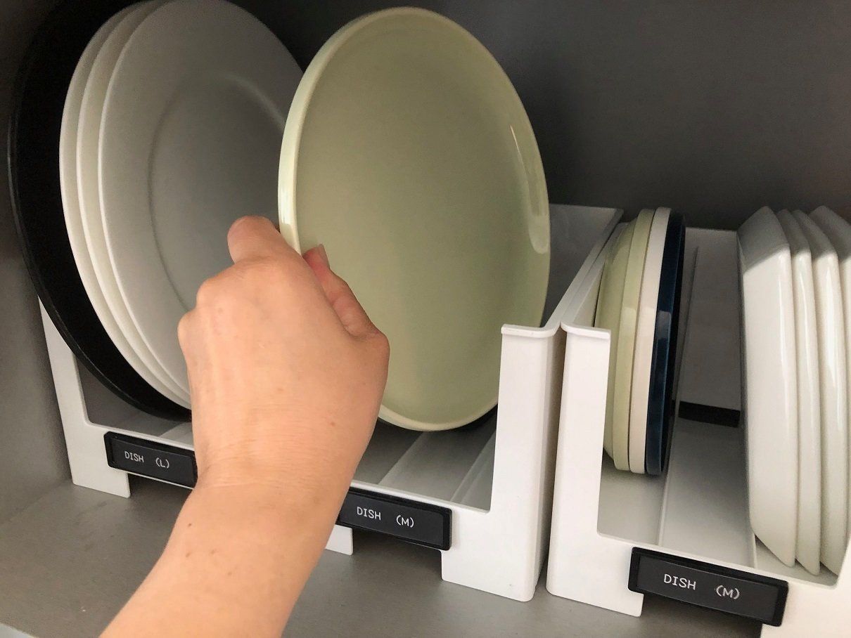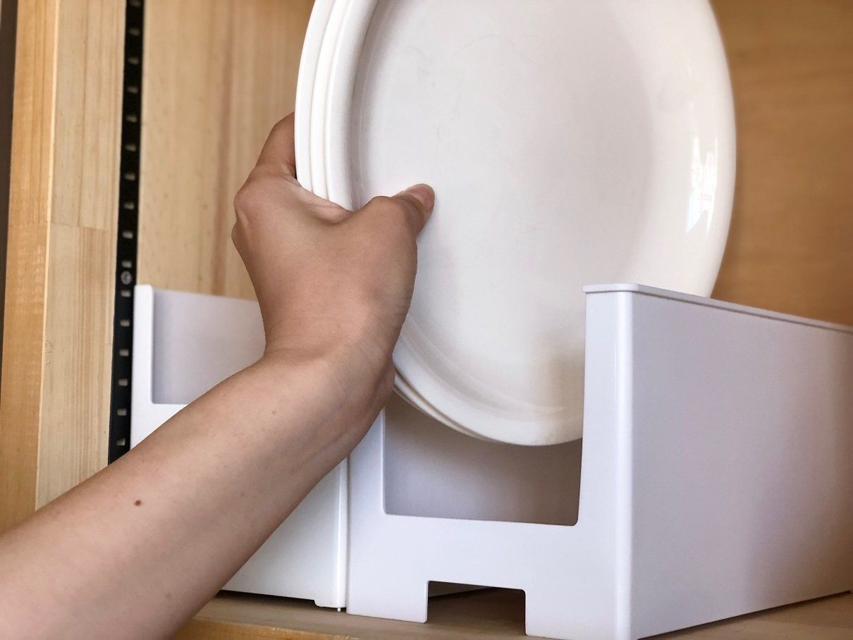 お皿を複数枚重ね置きしてしまうと、下のほうに入ってしまったものが取り出しにくく、戻しにくいですよね。そんなときに便利なのが、スキットシリーズの「立てて収納できる皿スタンド」(Mサイズ税込398円、Lサイズ税込498円)。シンプルで四角いフォルムなので、食器棚にもスッキリ収まります。