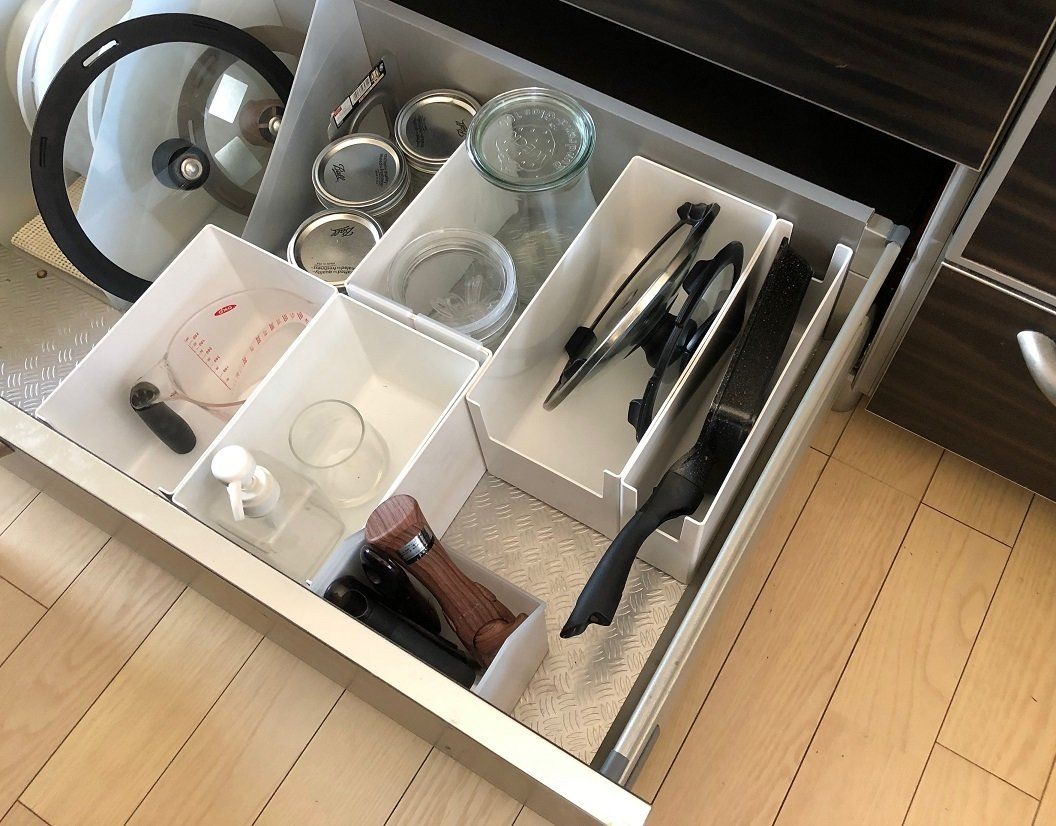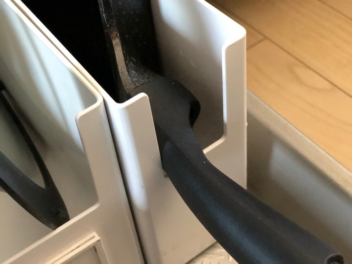 フライパン用のケースは、柄をつけたままでも安定して収納できます。