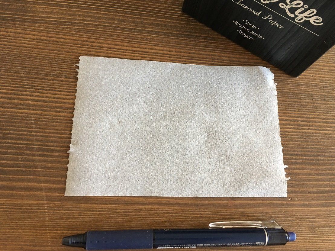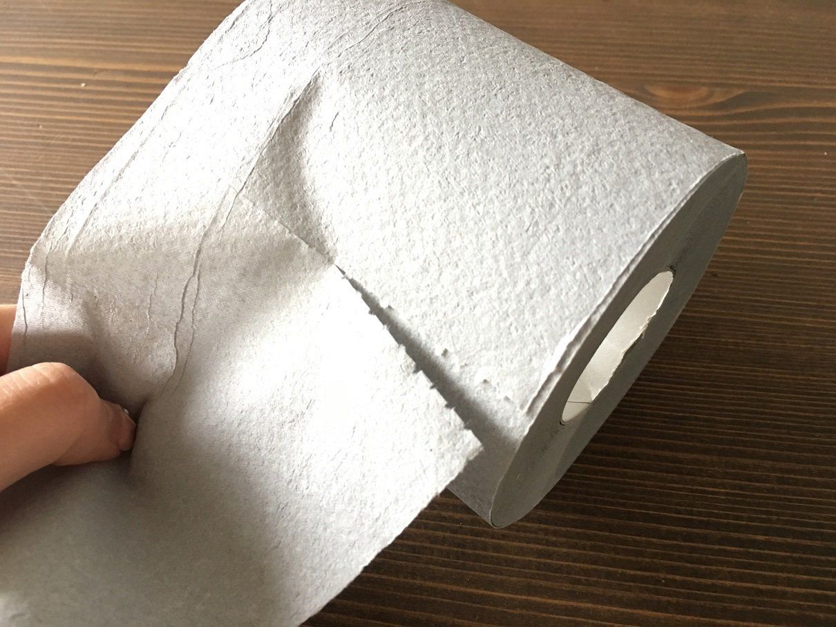 取り出してみると薄いグレーのロール紙でミシン目が約15センチ間隔で入っています。1枚の長さはボールペンと同じくらいです。このサイズ感を元に、量を調整しながら、使用することができます。