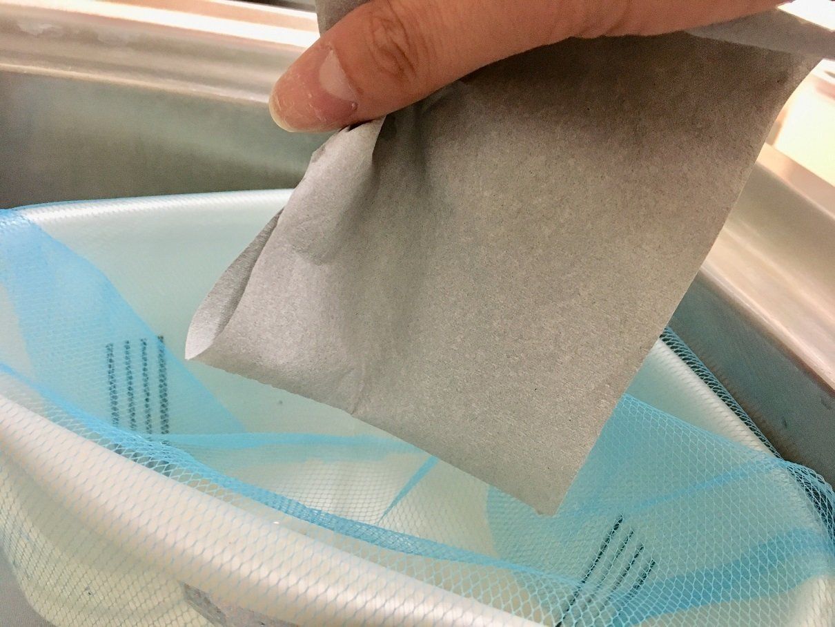 「脱臭炭 ニオイとり紙」の使い方は、臭いが気になるところへ入れるだけ。夏場は生ゴミの臭いが気になるキッチンなら、たとえば三角コーナーに入れておくのはいかがでしょう。