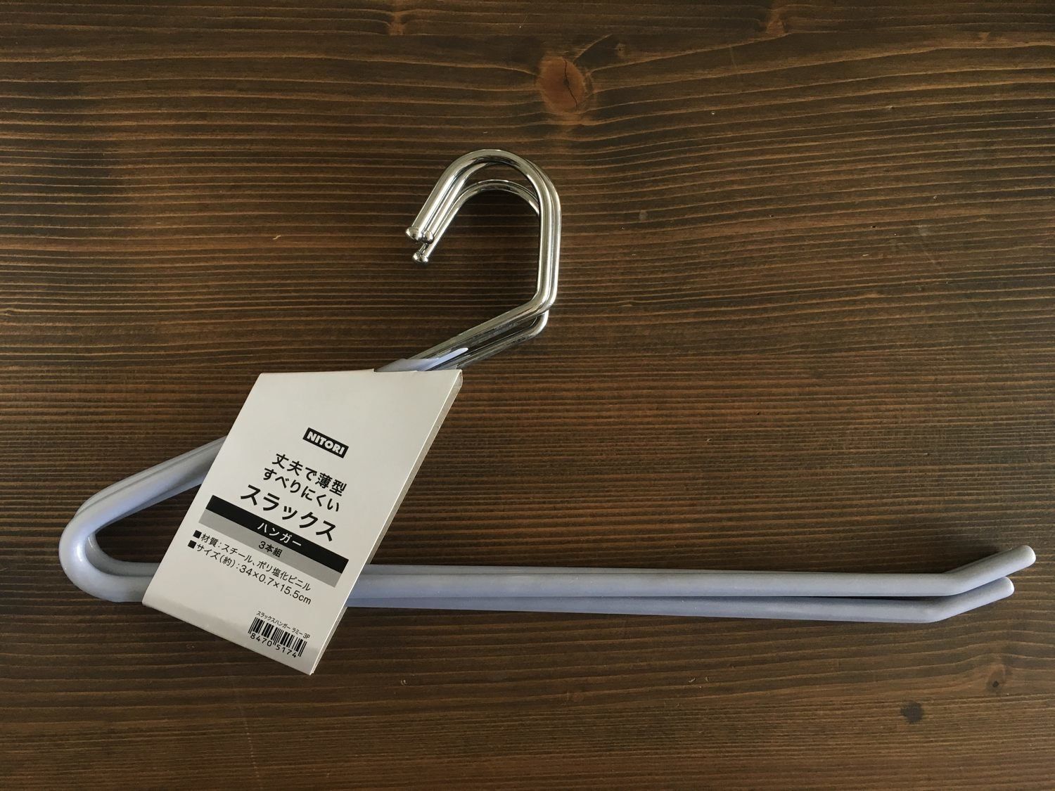 今回紹介するのは、ニトリの「すべりにくいスラックスハンガー(ラミー3本組)」。価格は304円です。幅34cmで、グレーの部分が、滑りにくいポリ塩化ビニル製になっています。