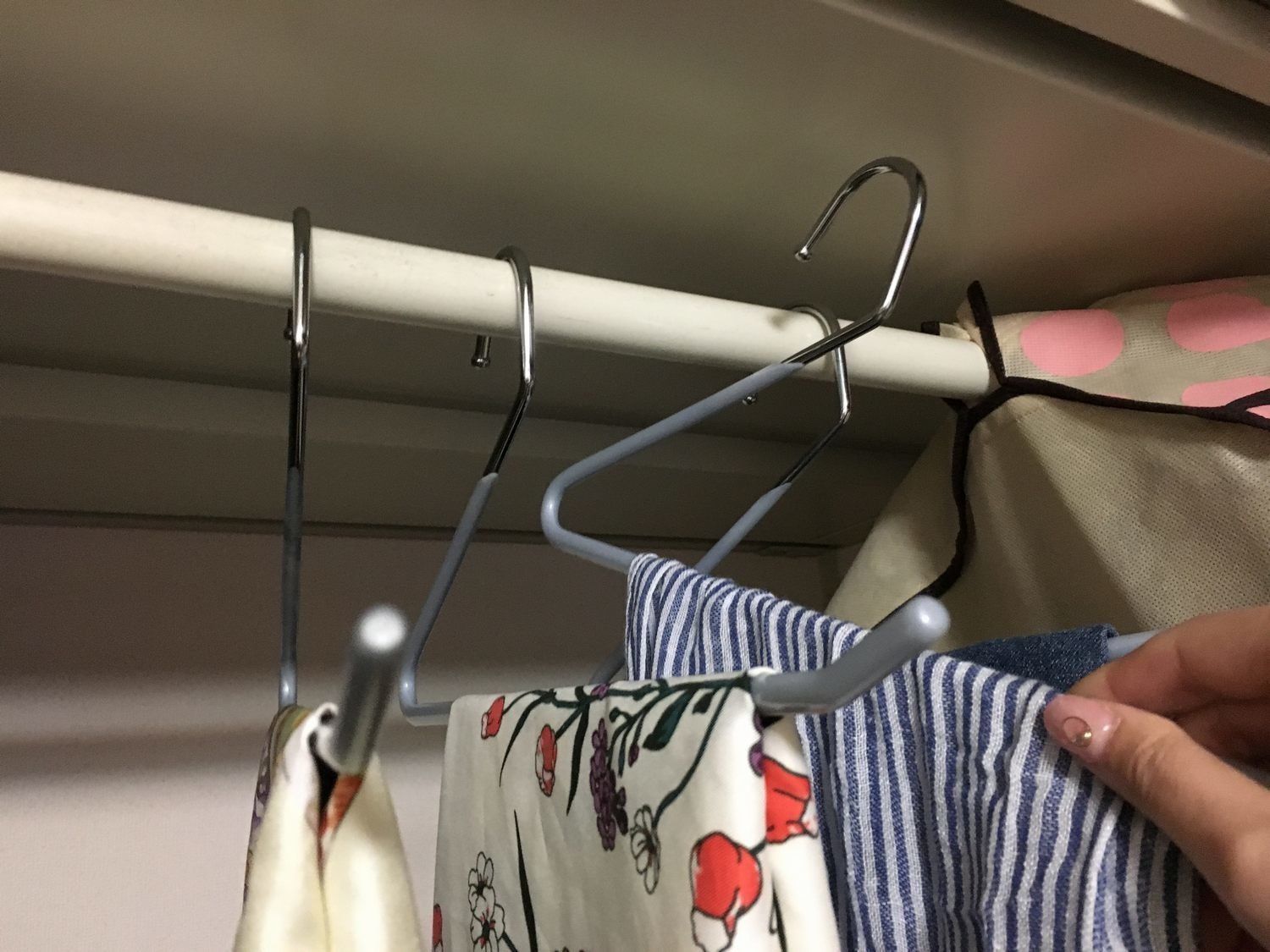 この商品、ラックにハンガーをかけたまま、モノの出し入れができるのがポイント。このハンガーの向きが逆だと、1度ハンガーを手にしてからモノを出し入れしなくてはいけないので少し時間がかかります。