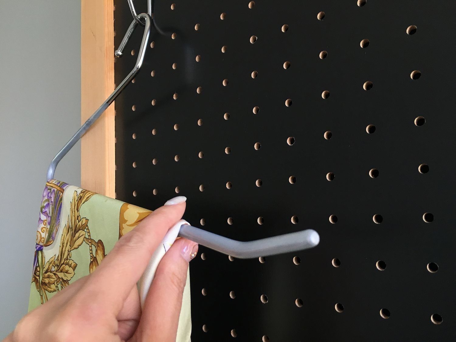商品名にもあるとおり「スラックス」をかけるのが本来の利用方法ですが、じつはスカーフやストールをかけるのにもピッタリ。スカーフやストールは、シルクやポリエステルの軽めで滑らかな素材が多く、普通のハンガーではどうしても落ちやすくなってしまいます。