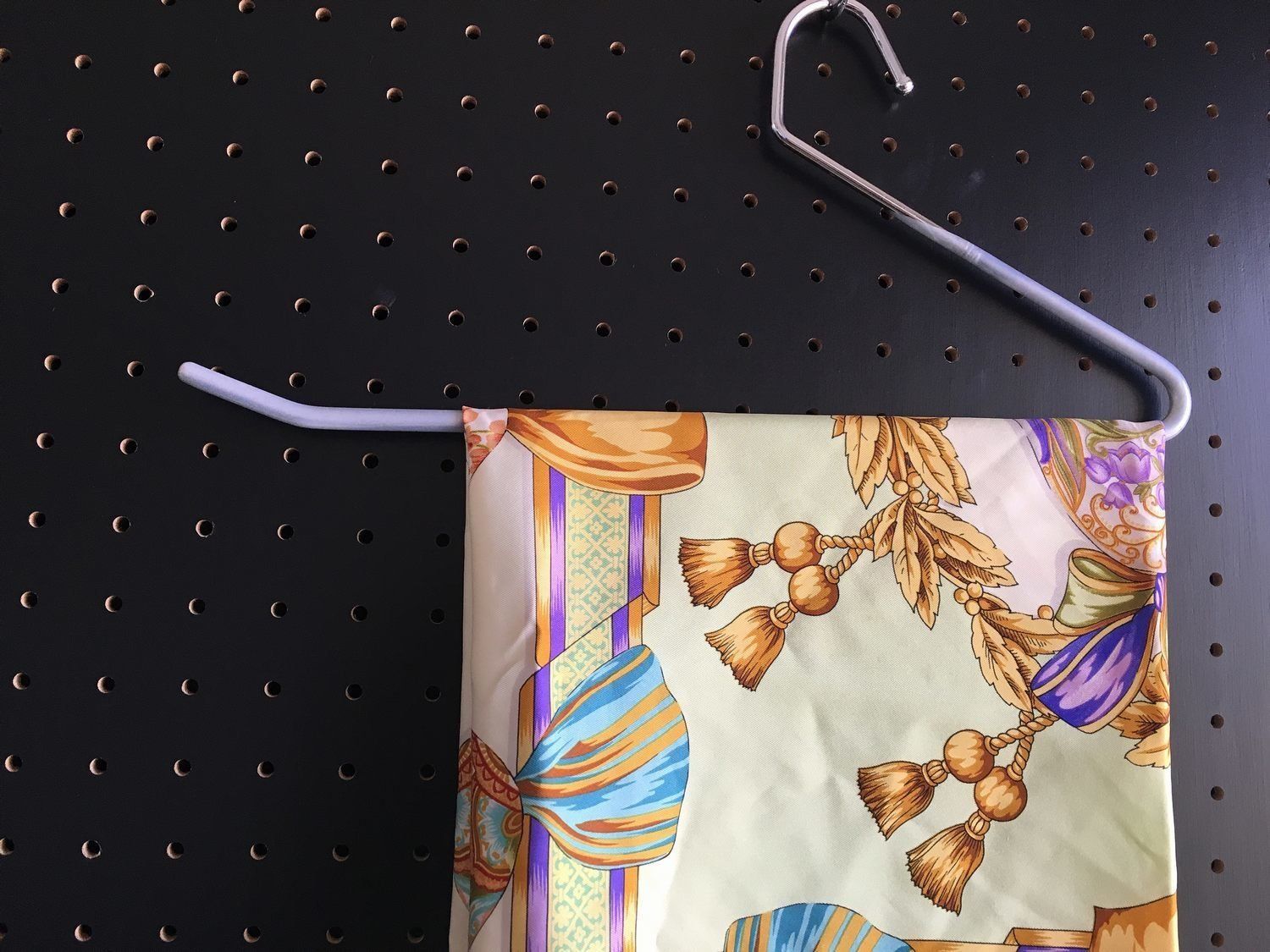 シルクスカーフの定番サイズは90cmまたは60cm前後が多いので、それぞれ1/4か半分になるようにたためば、幅34cmのハンガーでもラクラクかけられます。