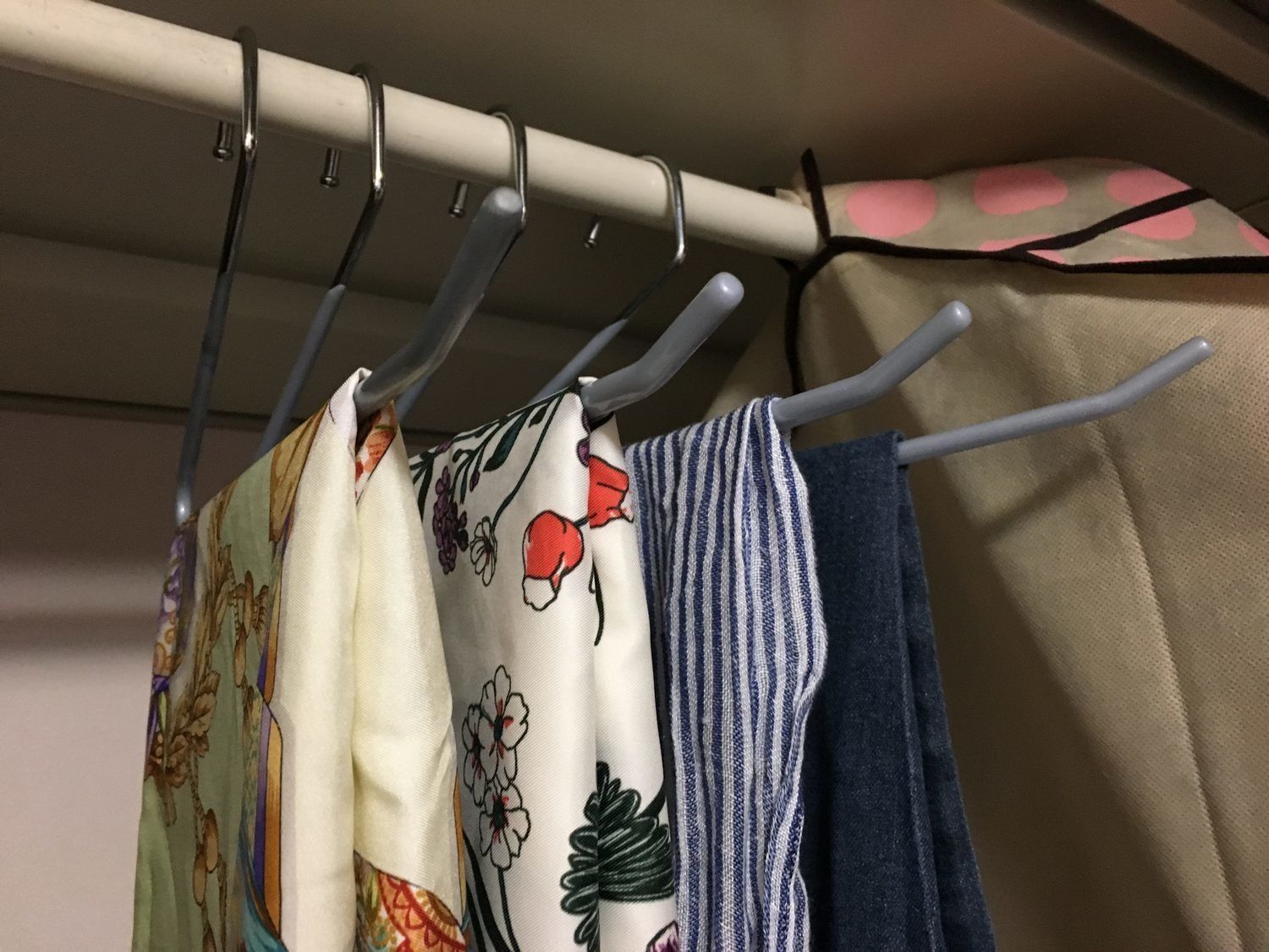 持っているスカーフを全部かけるスペースがないときは、自分がワンシーズンに使う数を把握して購入してみましょう。3本セットなのでまずは1セット使ってみるのはいかがでしょうか。