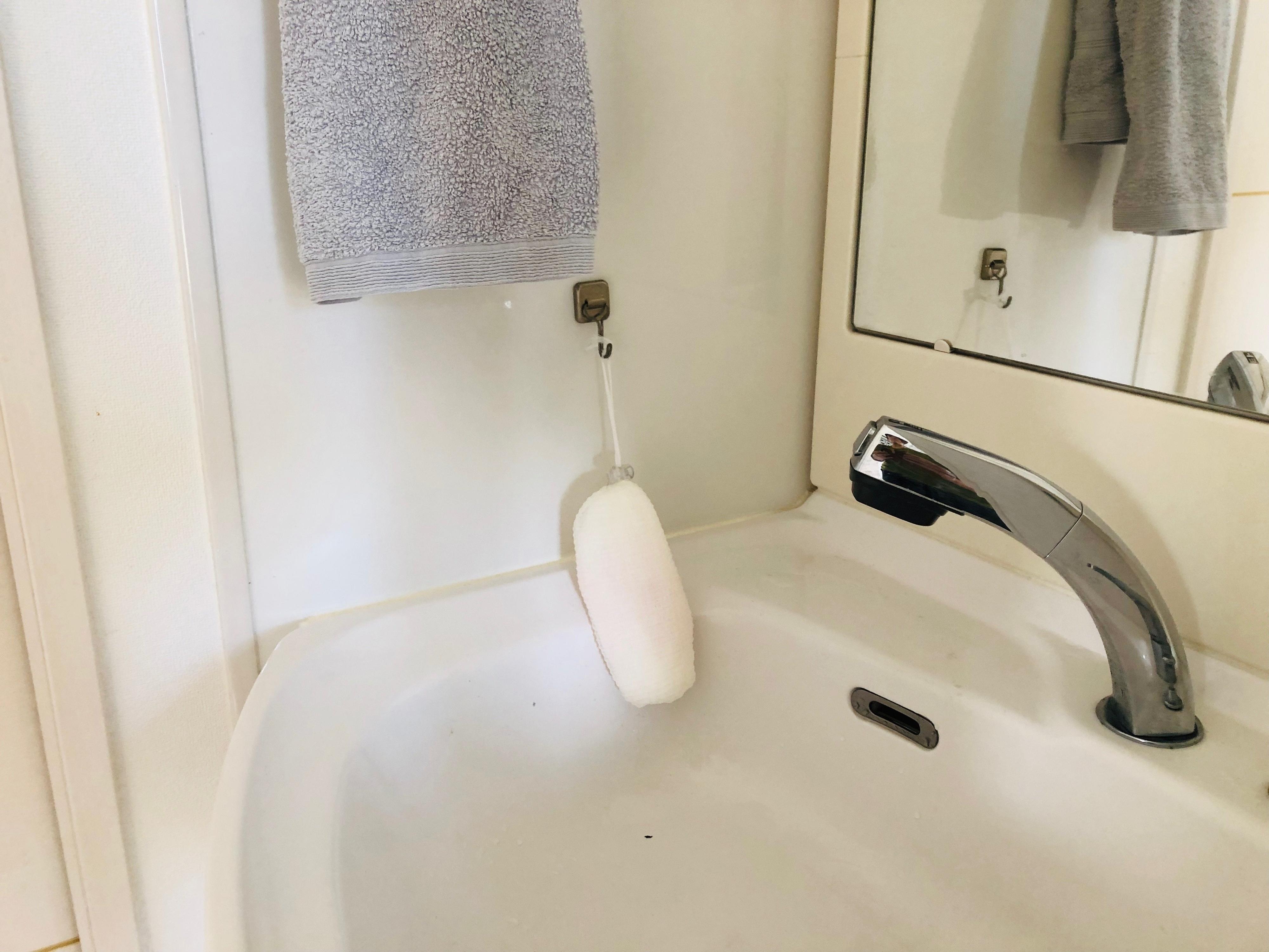 洗面所では水道のすぐ横にフックかけにしておけば使いやすいですよね。
