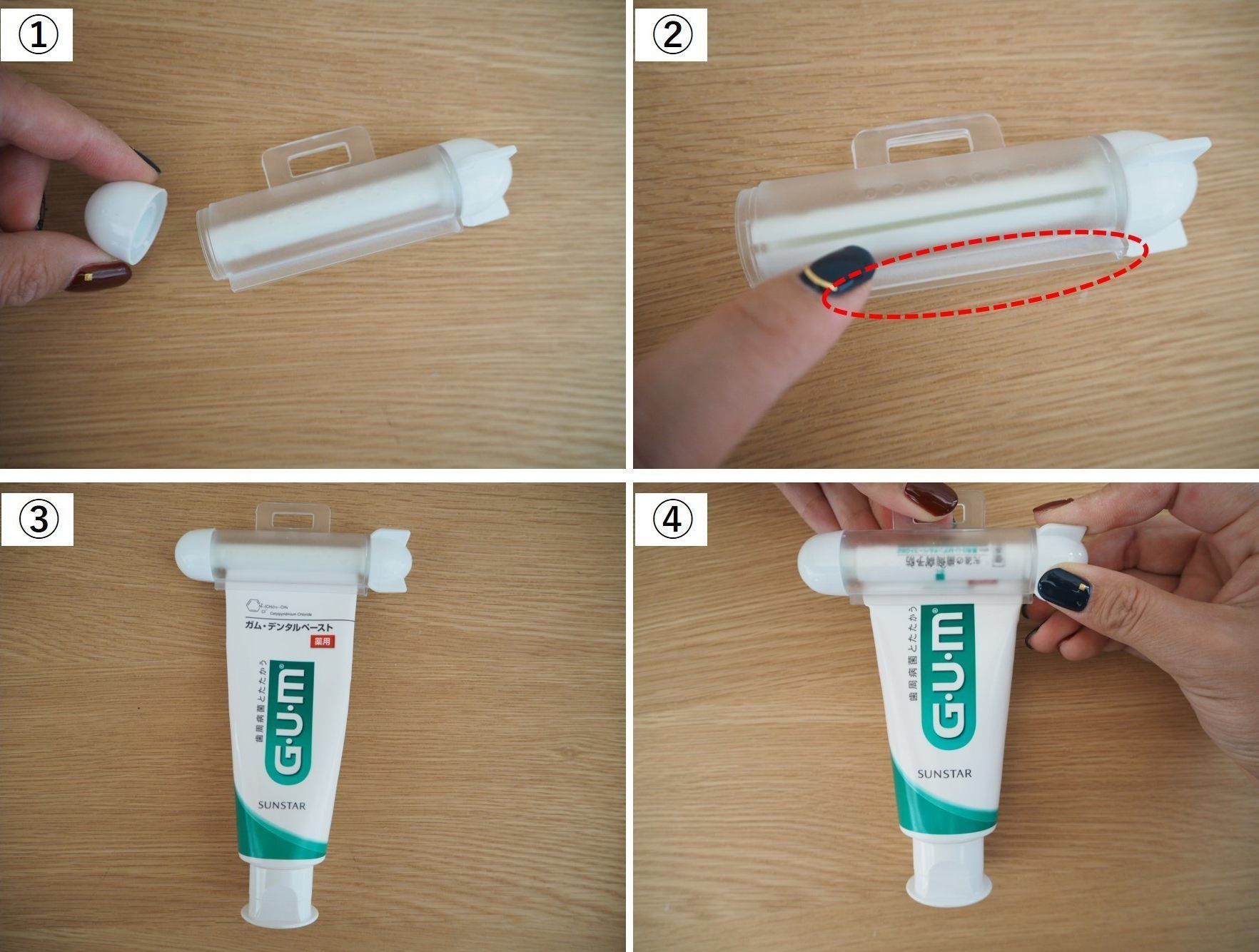 丸いキャップを戻せば「写真3」のような形になるので、これで絞りだす準備はOK!キャップの反対側にある取っ手を回せば上部がくるくると回り、チューブを簡単に絞りだすことができるようになります!