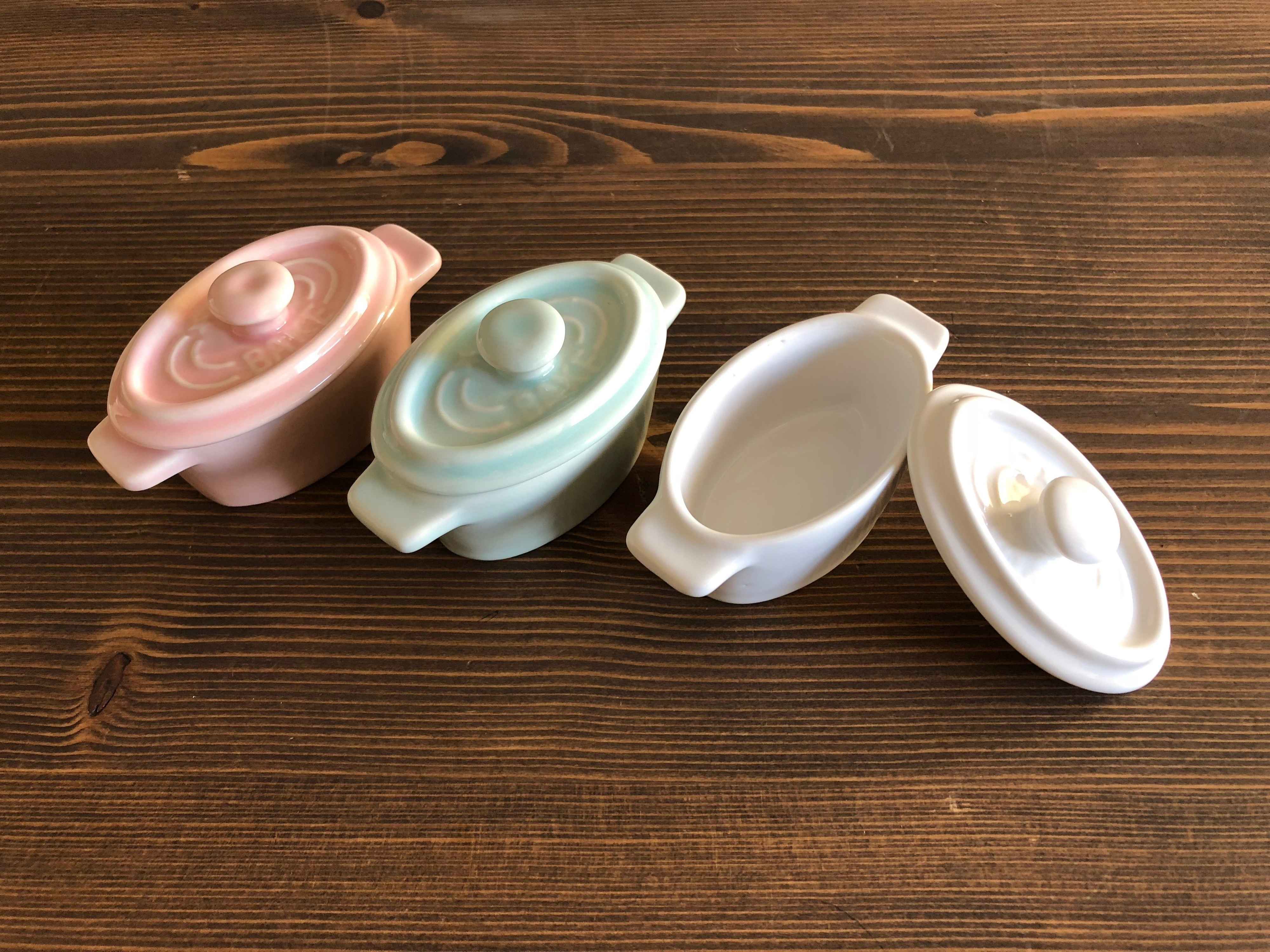 セリアのミニココット、カラーバリエーションはパステルカラー3色で、形違いもあります。価格はいずれも100円(税別)。