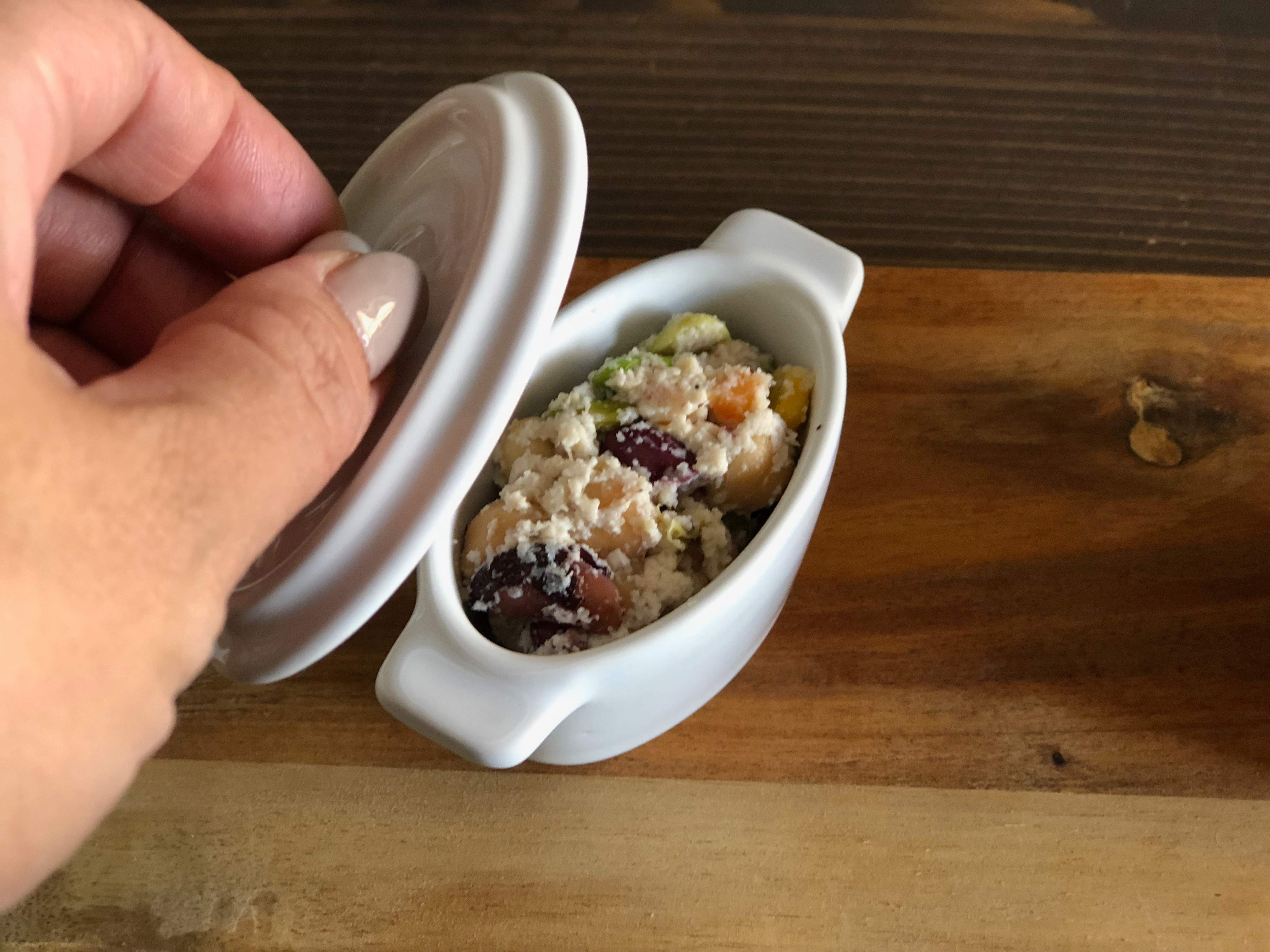 こちらは白和えを入れてみた状態。ちょっとした量のおかずを入れるのに最適なサイズ感ですね。