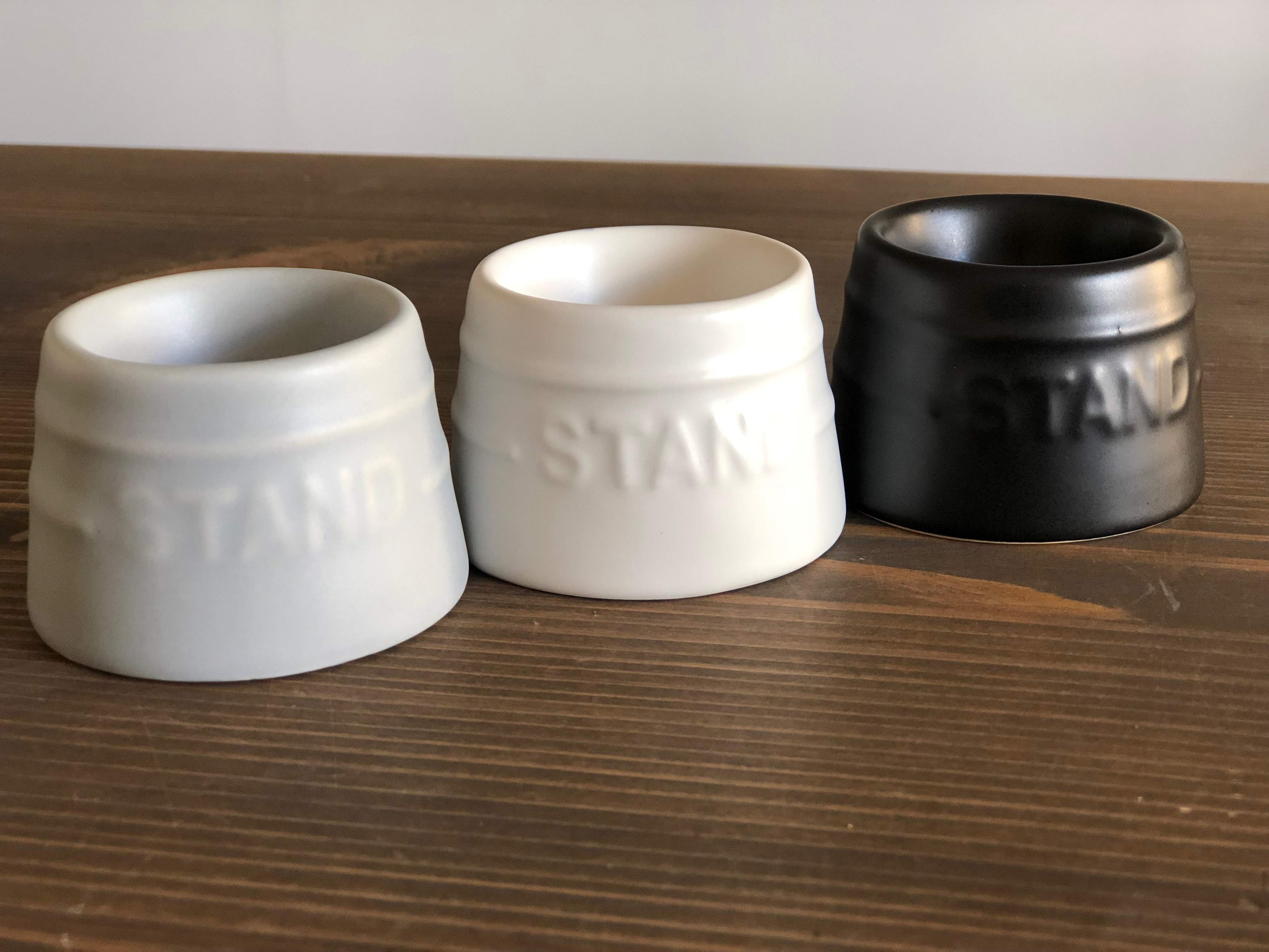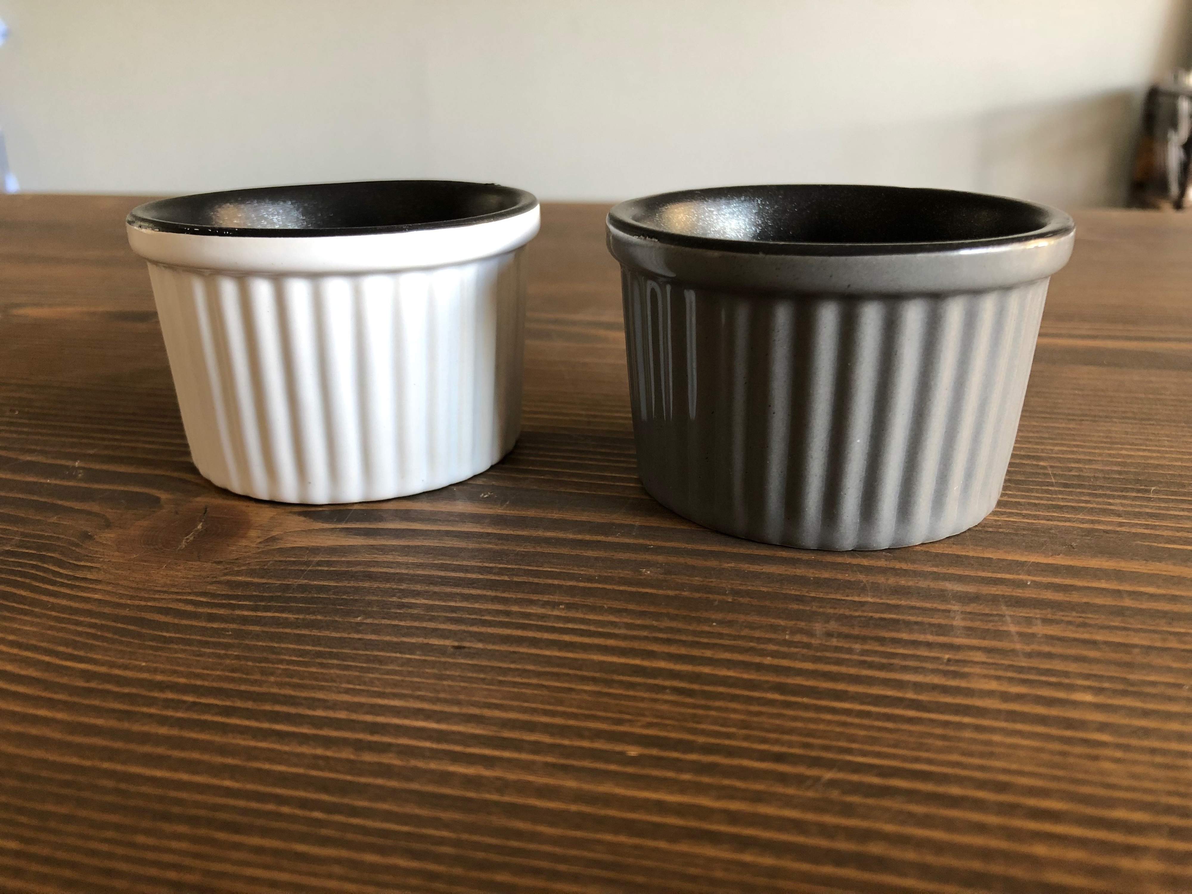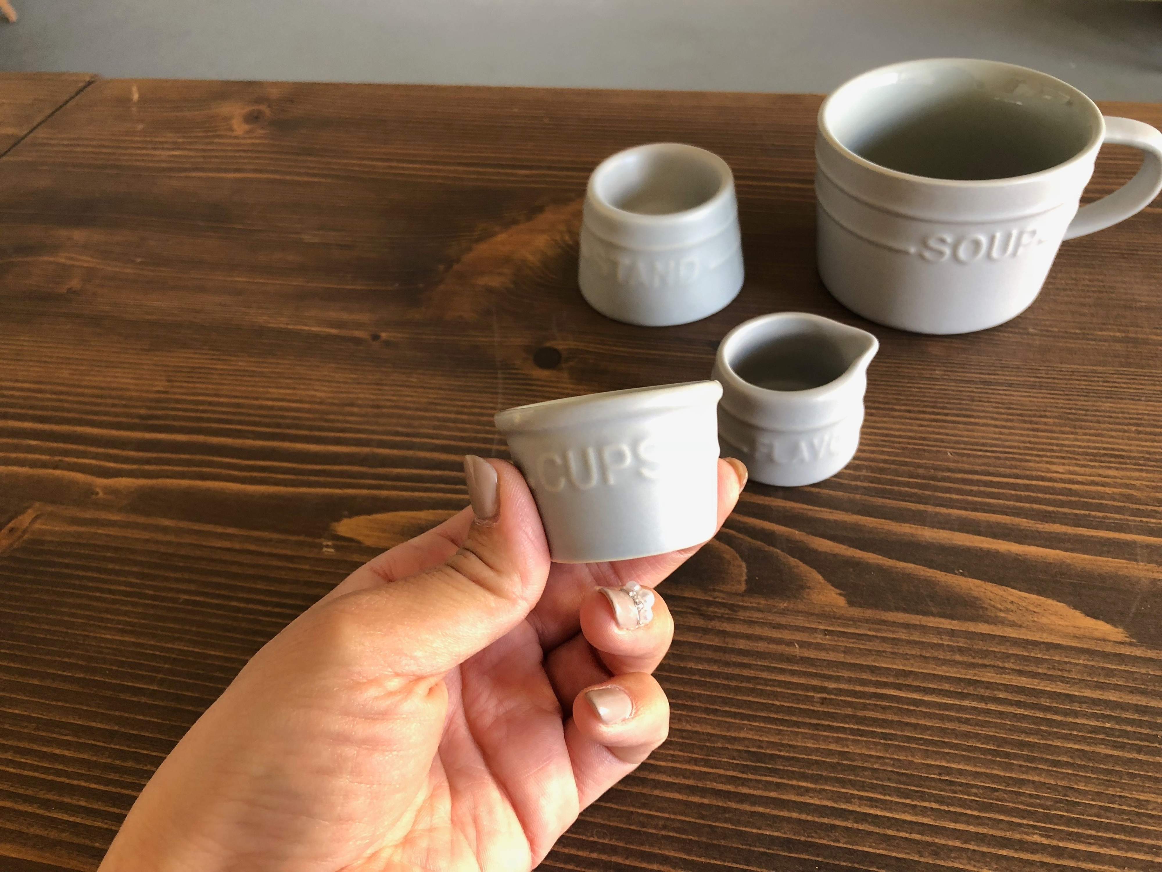 こんなにカワイイサイズのカップもあります。写真で手に持っているのは、ケチャップやマヨネーズなどを入れて野菜スティックなどをつけるときに便利そうですね。口に注ぎ口がある器はソースやたれなどを入れて使うのがおすすめ。奥のマグカップ容器はゆで卵のスタンドとして大活躍です。