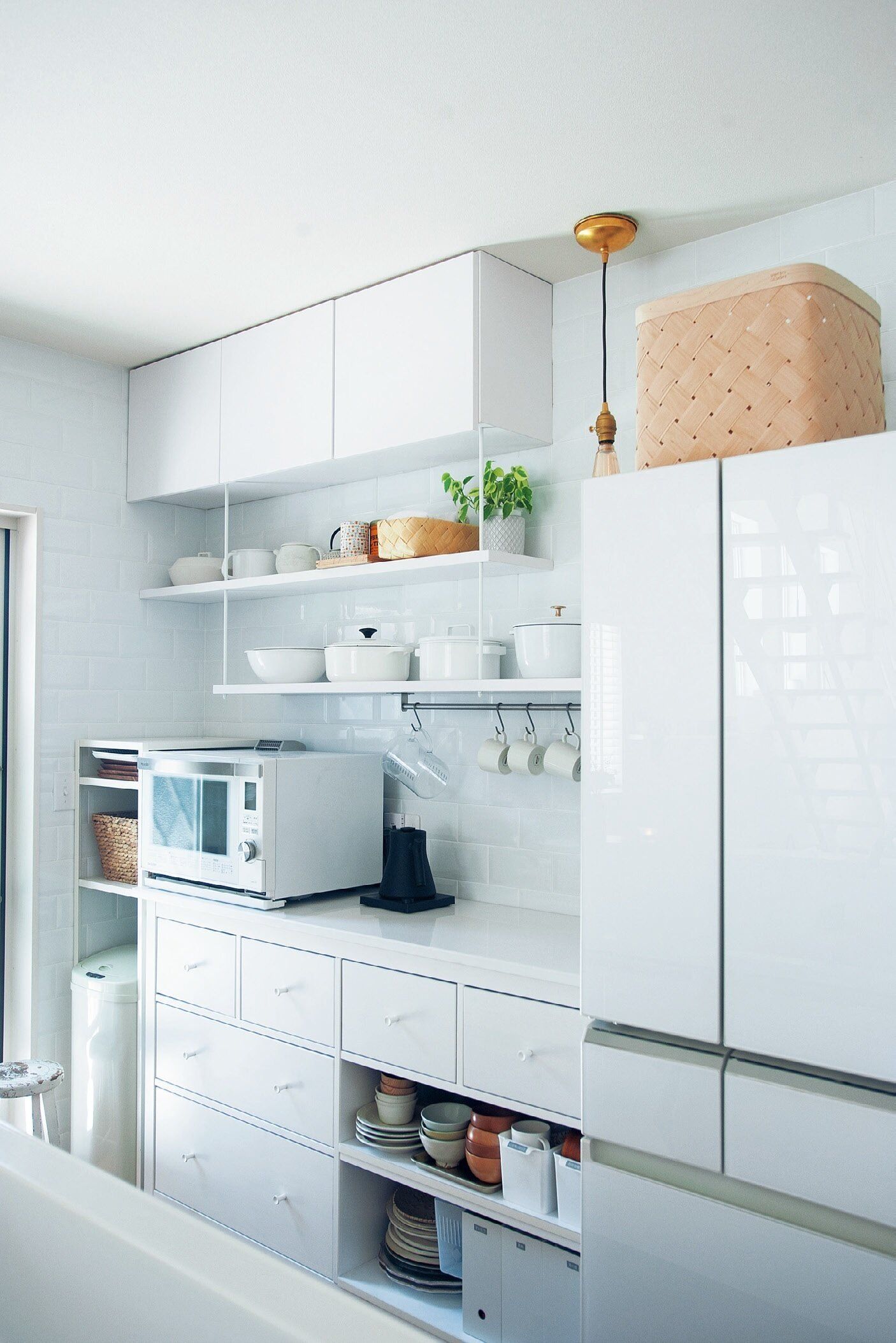 シンクまわりに出しっ放しの物はなく、目に入る調理道具は白で統一。おさよさんのキッチンは、実に清らかな空間です。「料理も掃除もスムーズにできるように考えてのこと。私はテキパキと動けるタイプじゃなくて、結婚当初は夕飯作りに3時間もかかっていたんです。『どういうこと?』って思いますよね(笑)。今は収納に助けられて手早く調理できています」。