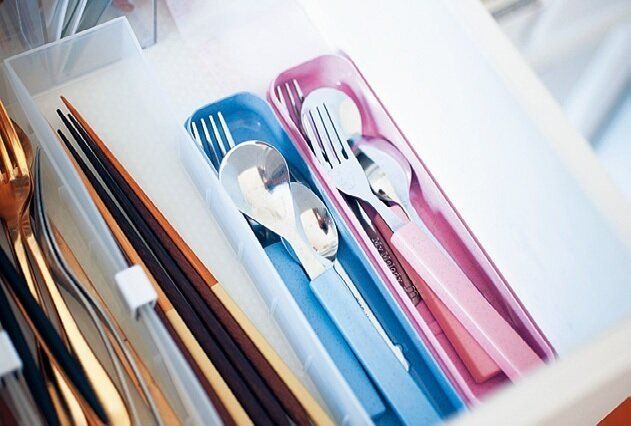 よく使うカトラリーは作業台の上や引き出しの中に。「子どもでも手が届く高さに、ぱっと見てわかるように置くと、子どもが自分で出し入れしてくれるのでラクちんなんです」。