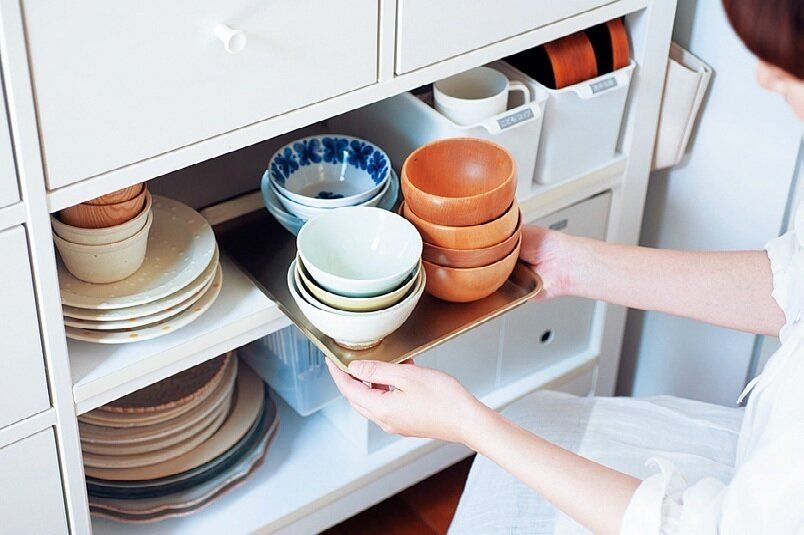 ご飯茶碗、お椀、ヨーグルト用の食器もトレーにひとまとめ。食器選びに迷うことなく使えます。食器棚の下段の引き出しを抜いて取り出しやすくしたことで、子どももお手伝いしてくれるそう。