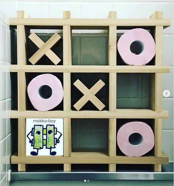 こちらのトイレットペーパーラックは、端材を使ってつくったという遊び心のあるペーパーラックです。小さいころに一度は遊んだことのある○×ゲームをトイレットペーパーと木材で表しており、思わずトイレの中で遊びたくなるほど。杉板を使っているので消臭効果もあり、トイレ内が木材のいい香りで包まれるのも、木工でつくったラックのおすすめポイントです。